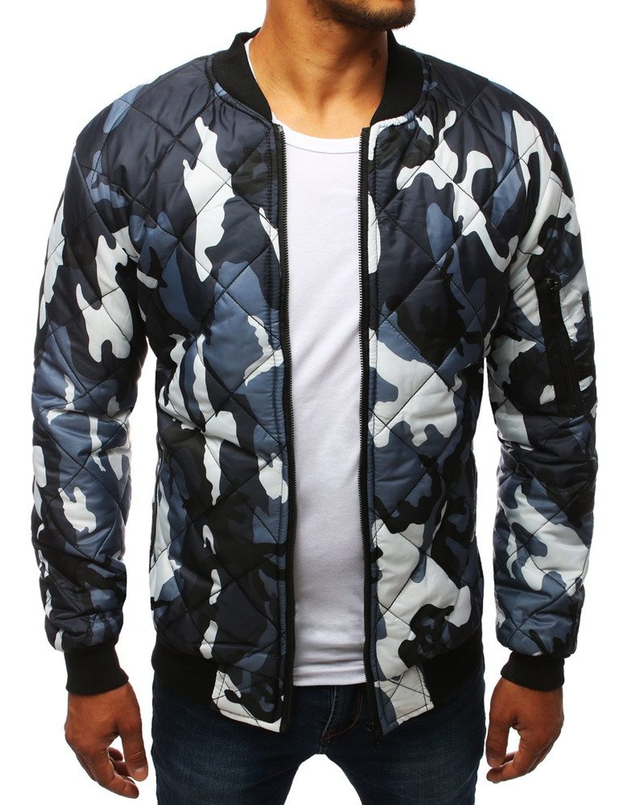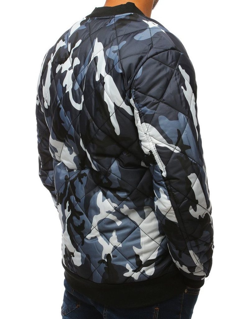Sötét kék terepmintás férfi steppelt dzseki. Kiváló minőségű, puha anyagból készült, mely teljes felületén steppelt szögletes steppelt varrással van díszítve. Cipzárral záródó. Kapucni nélküli modell. Minőségi eldolgozású. Könnyű, átmeneti dzseki. Két oldalsó cipzáros rögzítésű zsebbel ellátva. Egy zsebbel a kar részén. Bármilyen outfit-hez.