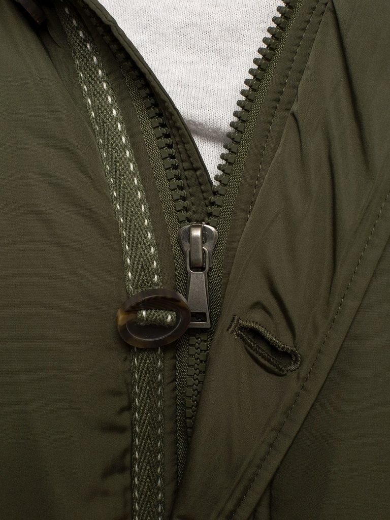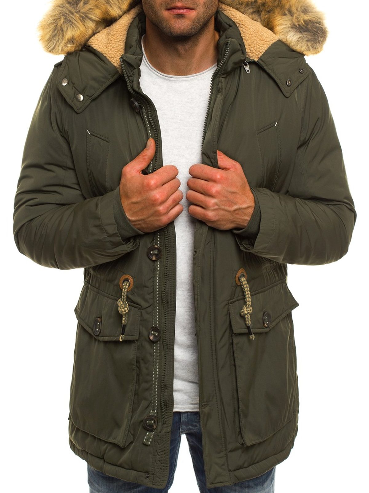 Ez a parka kabát igazi klasszikus. Trendi kahaki zöld színben. Olyan bélelt kapucnival látták el, amely enyhe időben levehető.  Rejtett, cipzár és kívül gombolással záródik a levehető műszőrme gallér kiegészítő védelmet nyújt a szél és a hideg ellen. A derékbőség végelzárós húzózsinórral állítható. Belső zseb. Praktikus zsebekkel és részeletekkel. Meleg puha béléssel rendelkezik. Jól párosíthatóak farmerral vagy elegánsabb nadrággal.