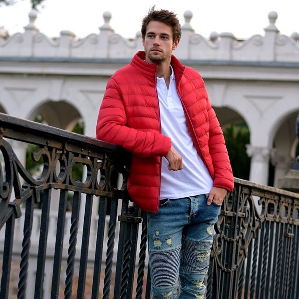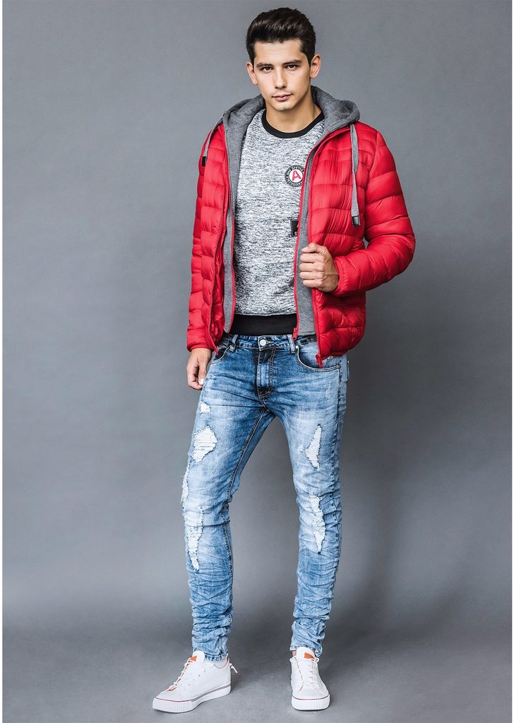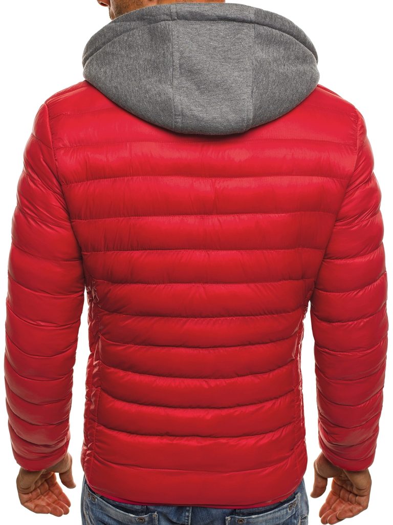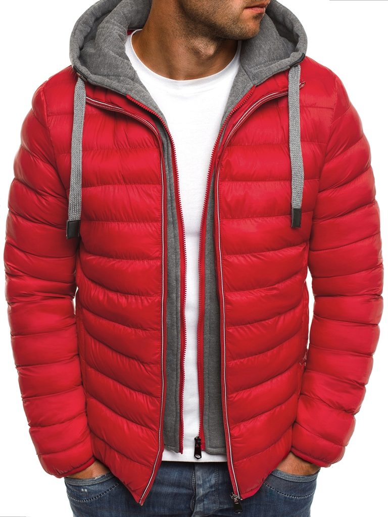 Rendkívül stílusos, modern átmeneti steppelt dzseki. Piros színben. Kiváló minőségű, puha, szép esésű anyagból készült. Enyhén testhezálló fazon, hosszú ujjakkal és kapucnis nyakkivágással. Szürke pamut anyagból készült kapucnival rendelkezik. Belső részben lekapcsolható pulóver imitáció. Elöl cipzáras rögzítés, kétoldalt benyúlós zsebek. Derékig érő hossz