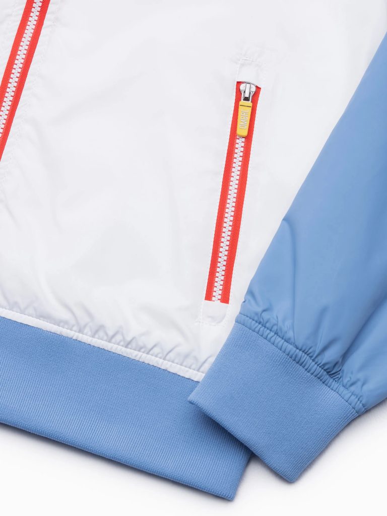 Kellemesen puha, kevert pamutanyagból készült sportos dzseki. Könnyű férfi szabadidőkabát melegebb napokra. Sportos jelleget kölcsönöz minden összeállításnak. Kapucnoval rendelkezik, kihajtott gallér. Két oldalsó cipzáras zsebbel. Bordás kötésű szegély az ujjaknál és a derékrészen.