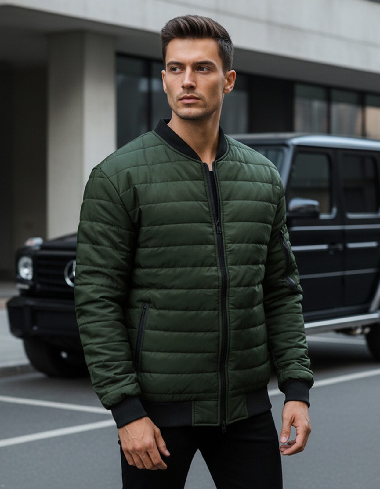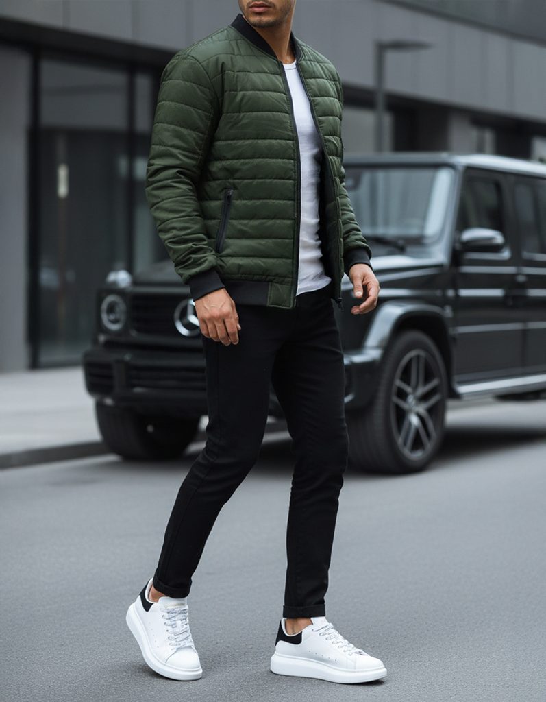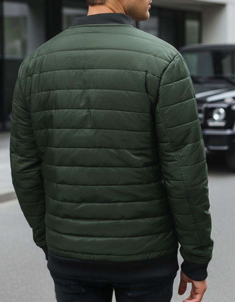 Zöld színű férfi átmeneti steppelt dzseki. Kiváló minőségű, puha anyagból készült, mely teljes felületén steppelt varrással van díszítve. Kapucni nélküli fazon. Cipzárral záródó.Ujjvégek rugalmas paszpóllal. Könnyű, átmeneti dzseki. Két oldalsó cipzáros rögzítésű zsebbel ellátva, egy belső zsebbel és egy zsebbel az újj részén rendelkezik. Bármilyen outfit-hez.