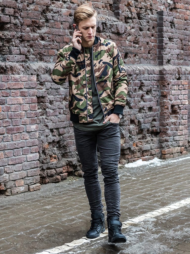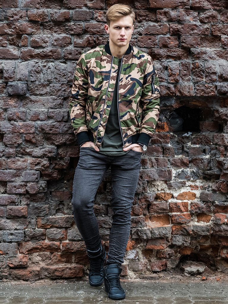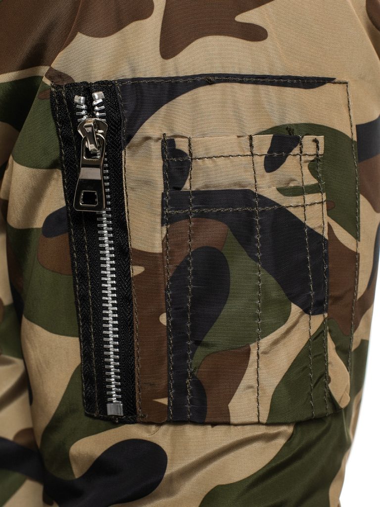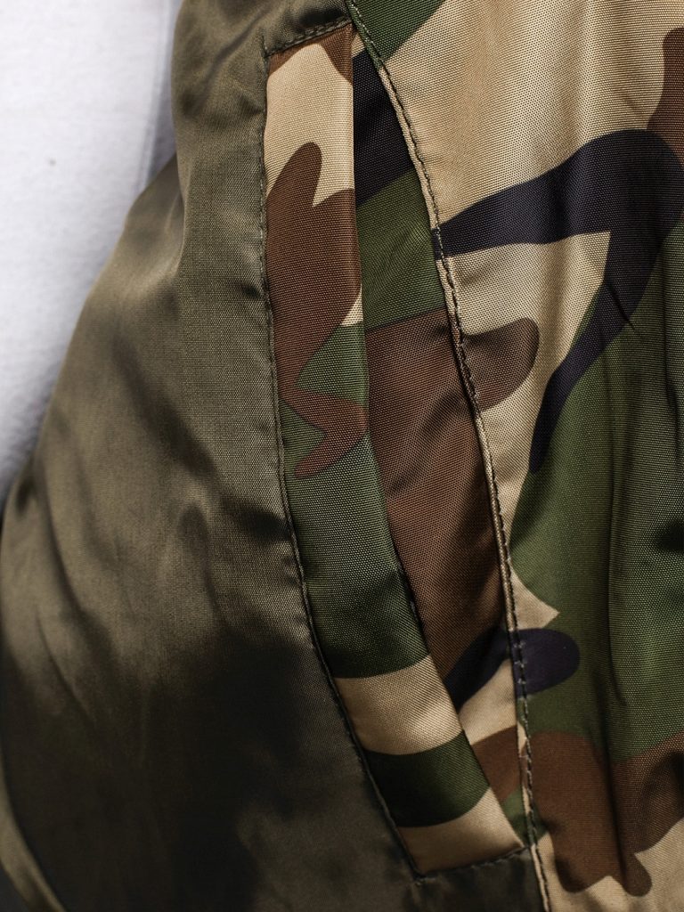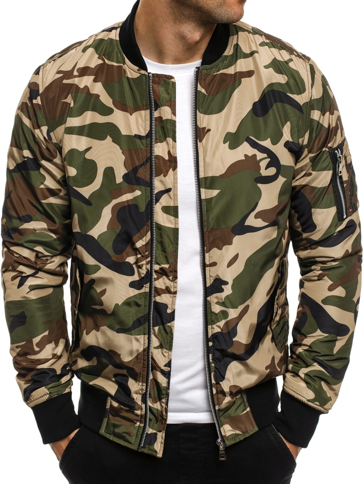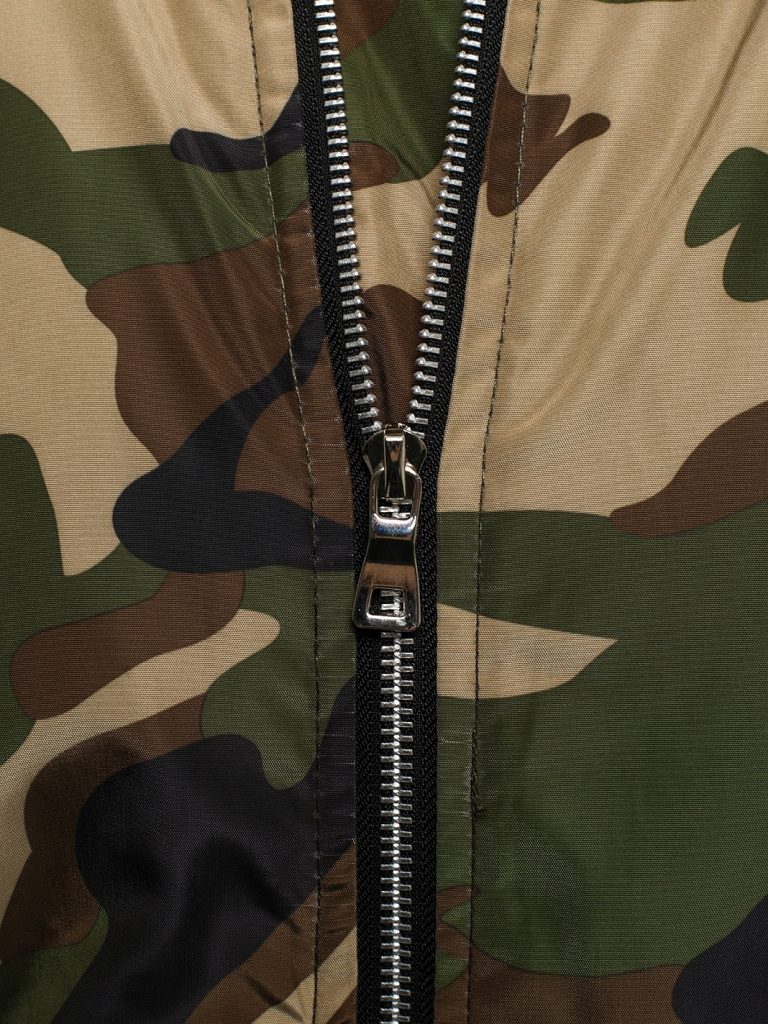 Trendi terepmintás bomber dzseki, átmeneti időszakra alkalmas viselet. Terepszínű kivitelben. Keskeny gallér, fekete színeb. A dzseki alja, és a derékrésze fekete rugalmas szegéllyel ellátva. Két praktikus oldalsó zsebbel, és a kar rézén is zsebbel rendelkezik.