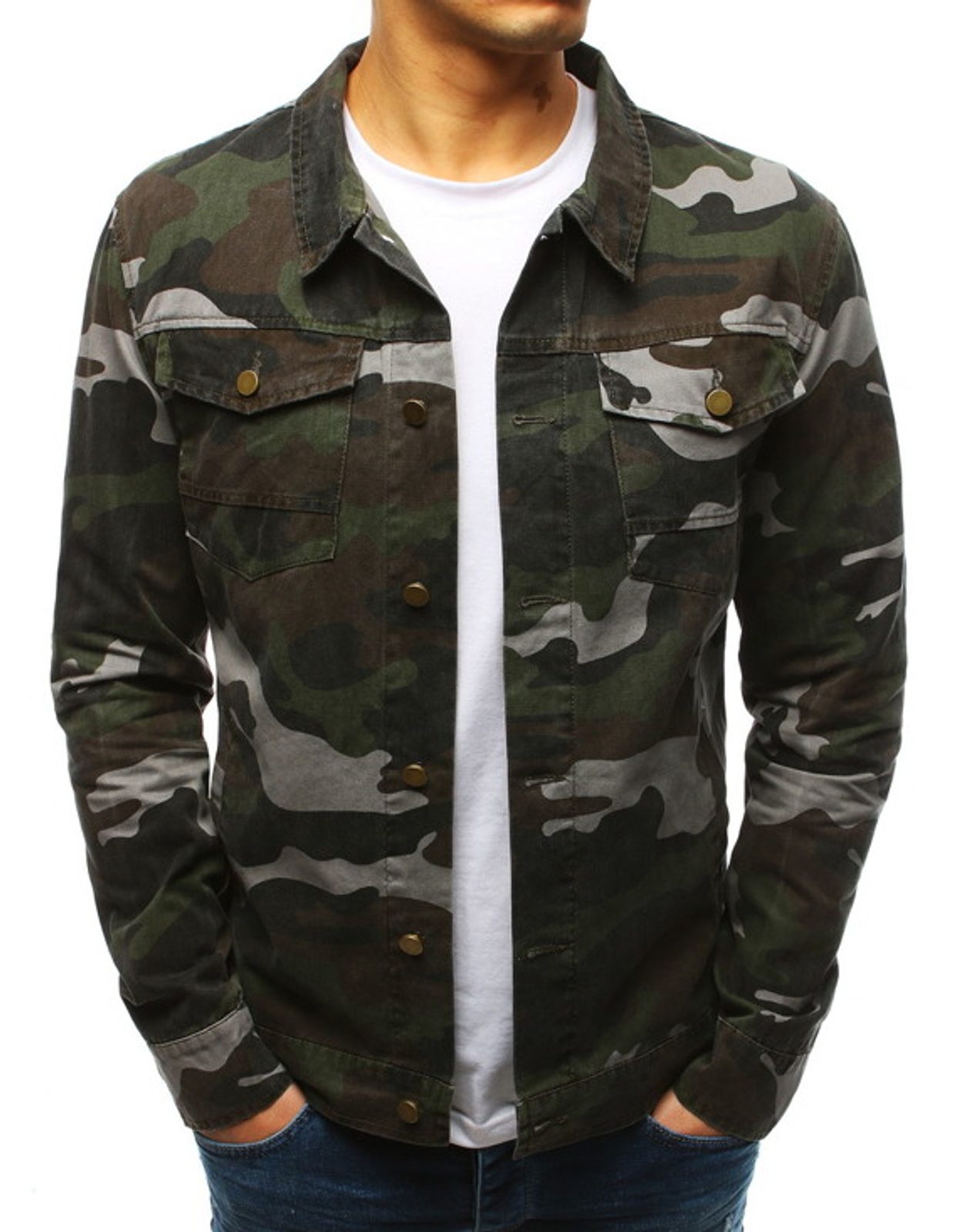 Terepmintás farmer dzseki. Kényelmes viselet a pamut anyagnak köszönehtően. Két gombos zsebbel ellátva. Divatos terepszínű kivitelben. Az elején négy külső zzebbel ellátva. Két belső zsebbel rendelkezik. Tökéletes hétköznapi viselet. Kombinálhatja melegítővel és fehér basic pólóval, amelyet megtalál kínálatunkban.