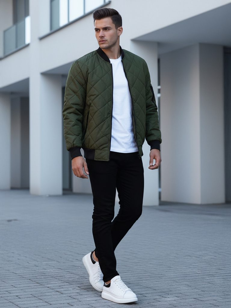 Zöld színű férfi steppelt dzseki. Kiváló minőségű, puha anyagból készült, mely teljes felületén steppelt szögletes steppelt varrással van díszítve. Cipzárral záródó. Kapucni nélküli modell. Minőségi eldolgozású. Könnyű, átmeneti dzseki. Két oldalsó cipzáros rögzítésű zsebbel ellátva. Egy zsebbel a kar részén. Bármilyen outfit-hez.