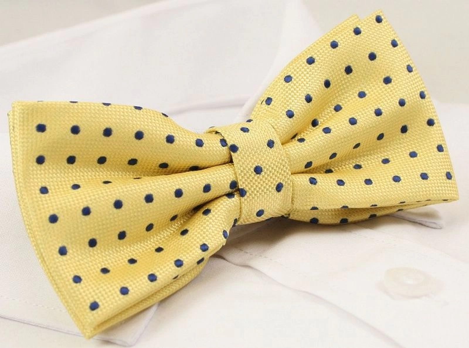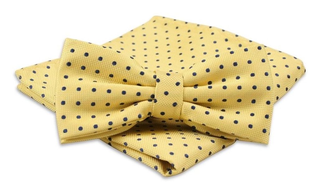 Divatos sárga csokornyakkendő szett, díszdobozban. Sárga alapon sötét kék pöttyökkel. Bármilyen eseményre. Bősége kapoccsal állítható.