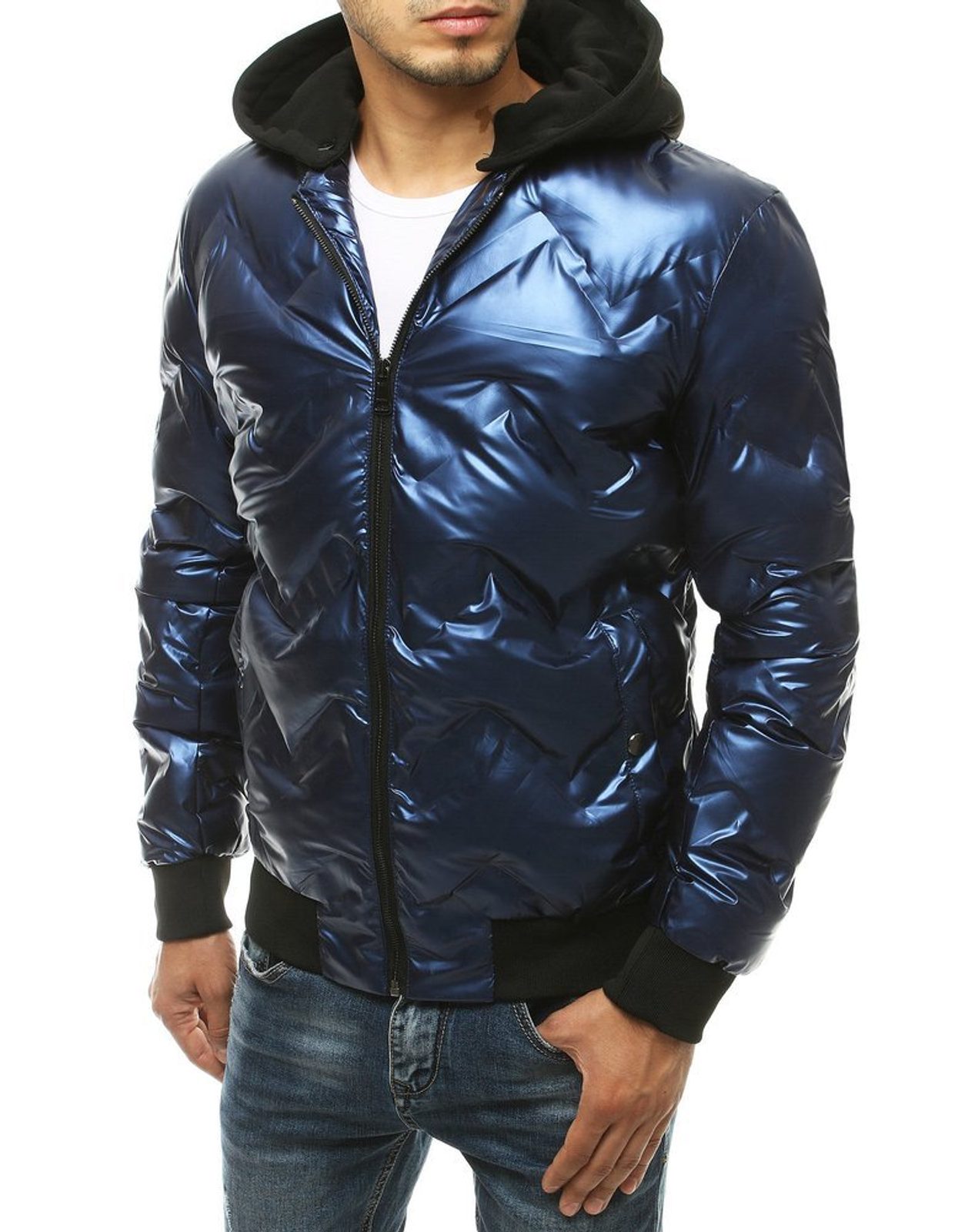 Sötét kék fényes férfi steppelt dzseki. Kiváló minőségű, puha anyagból készült, mely teljes felületén steppelt varrással van díszítve. Kapucnis dzseki. Cipzárral záródó. Minőségi eldolgozású. Könnyű téli dzseki. Fekete pamut kapucnival ellátva, mely lekpacsolható. Két oldalsó cipzáros rögzítésű zsebbel ellátva. Bármilyen outfit-hez.