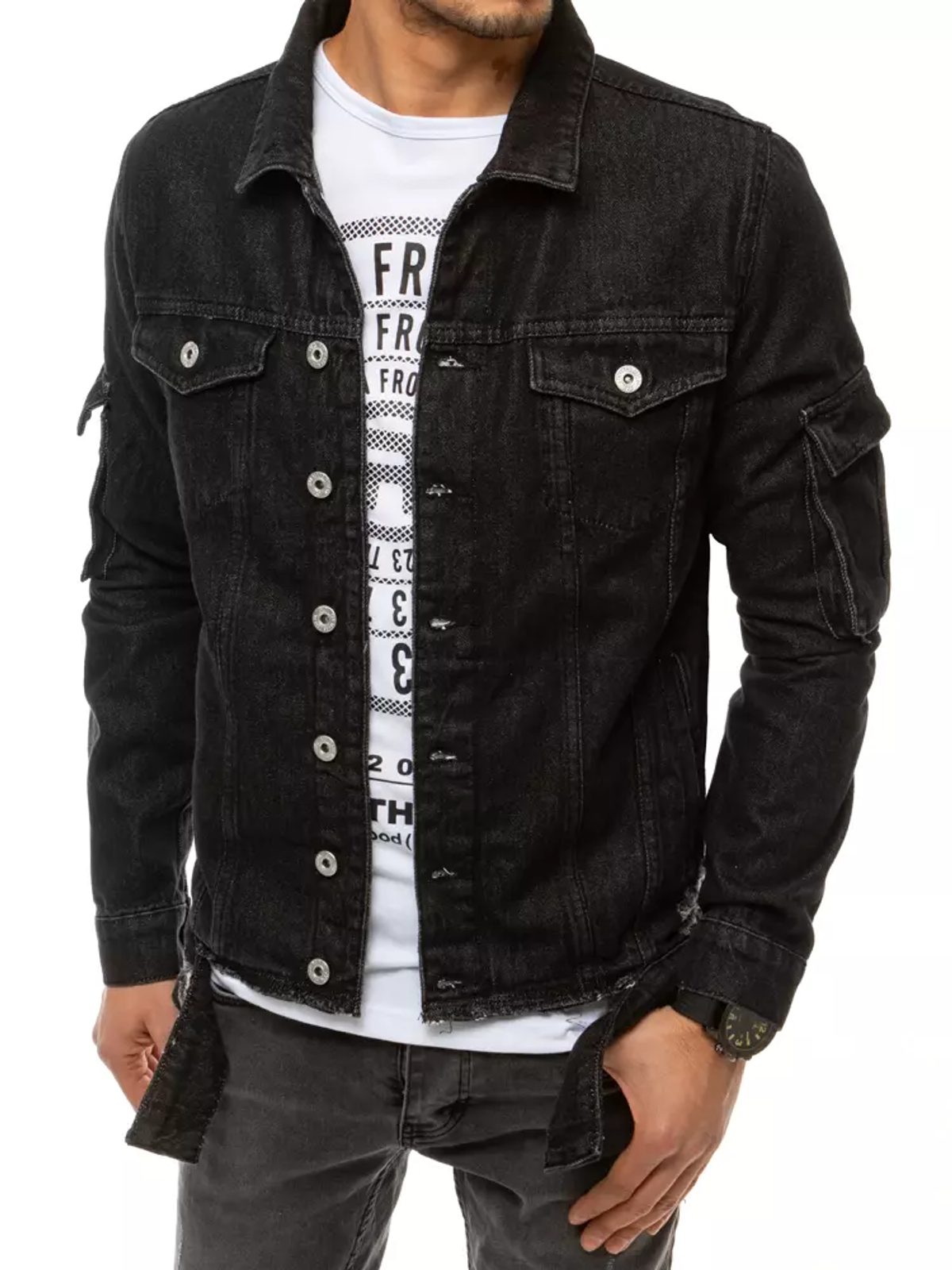 Modern farmerkabát. Fekete színben. Kényelmes viselet a pamut anyagnak köszönehtően. Két zsebefedős mell zsebbel ellátva. Erősen tépett résezkkel a hátsó részén, valamint az alsó része feltűnéo tépett részekkel rendelkezik. Az ujj részén is zsebfedős zsebbel rendelkezik. Gombos mandzsettával. Tökéletes hétköznapi viselet. Gombos rögzítéssel.