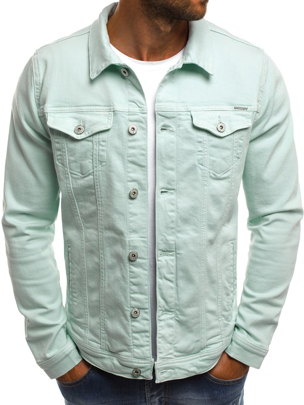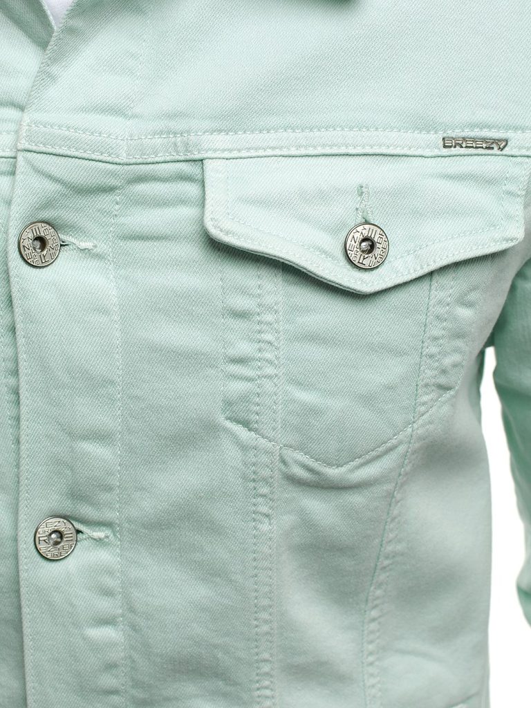 Modern farmerkabát. Mentol színben. Kényelmes viselet a pamut anyagnak köszönehtően. Két gombos zsebbel ellátva a mellkas részen. Tökéletes hétköznapi viselet. Kombinálhatja melegítővel és fehér basic pólóval, amelyet megtalál kínálatunkban.