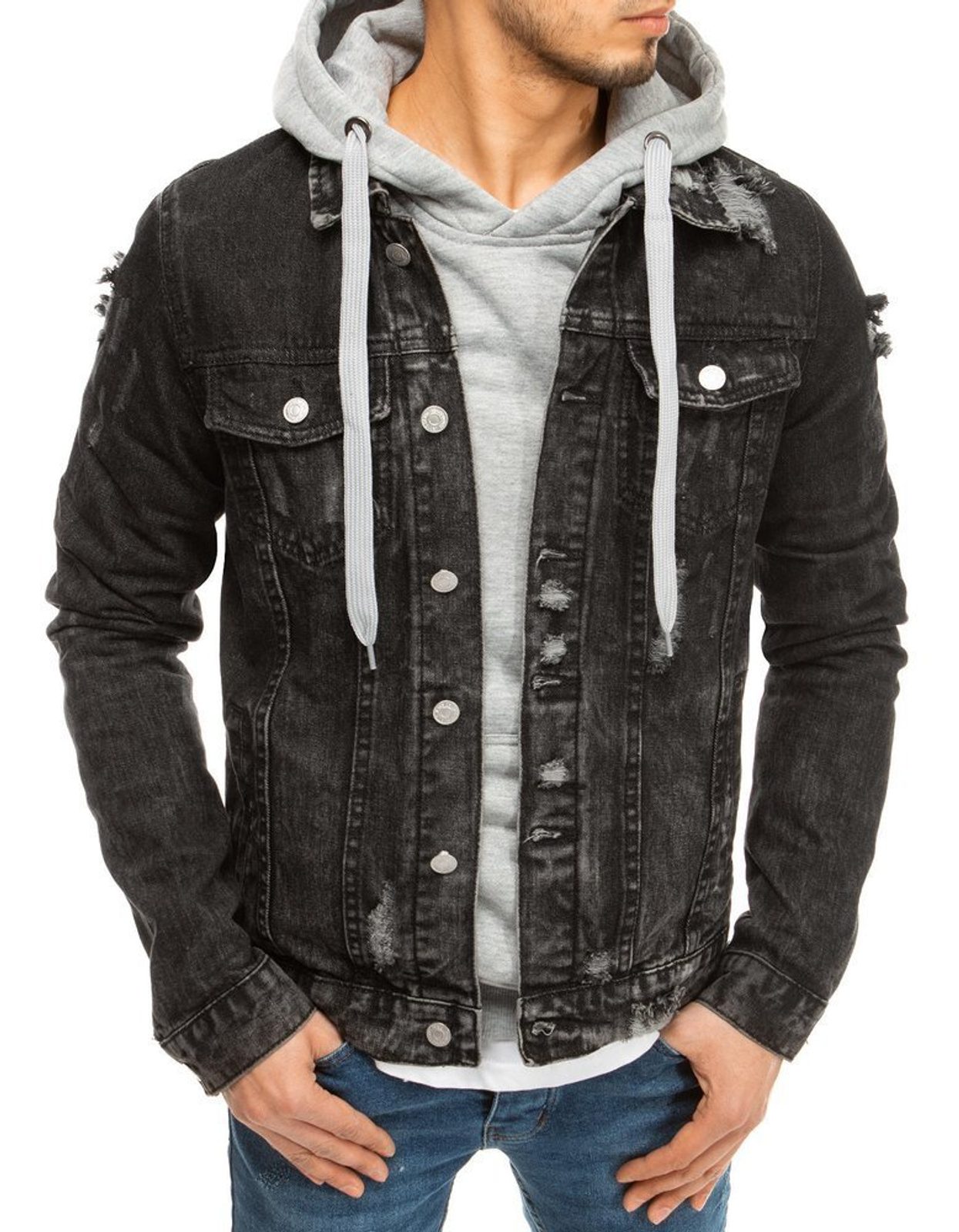 Modern farmerkabát. fekete színben. Tépett részekkel. Kényelmes viselet a pamut anyagának köszönhetően. Két zsebefedős mell zsebbel ellátva. Gombos mandzsettával. Tökéletes hétköznapi viselet. Gombos rögzítéssel.