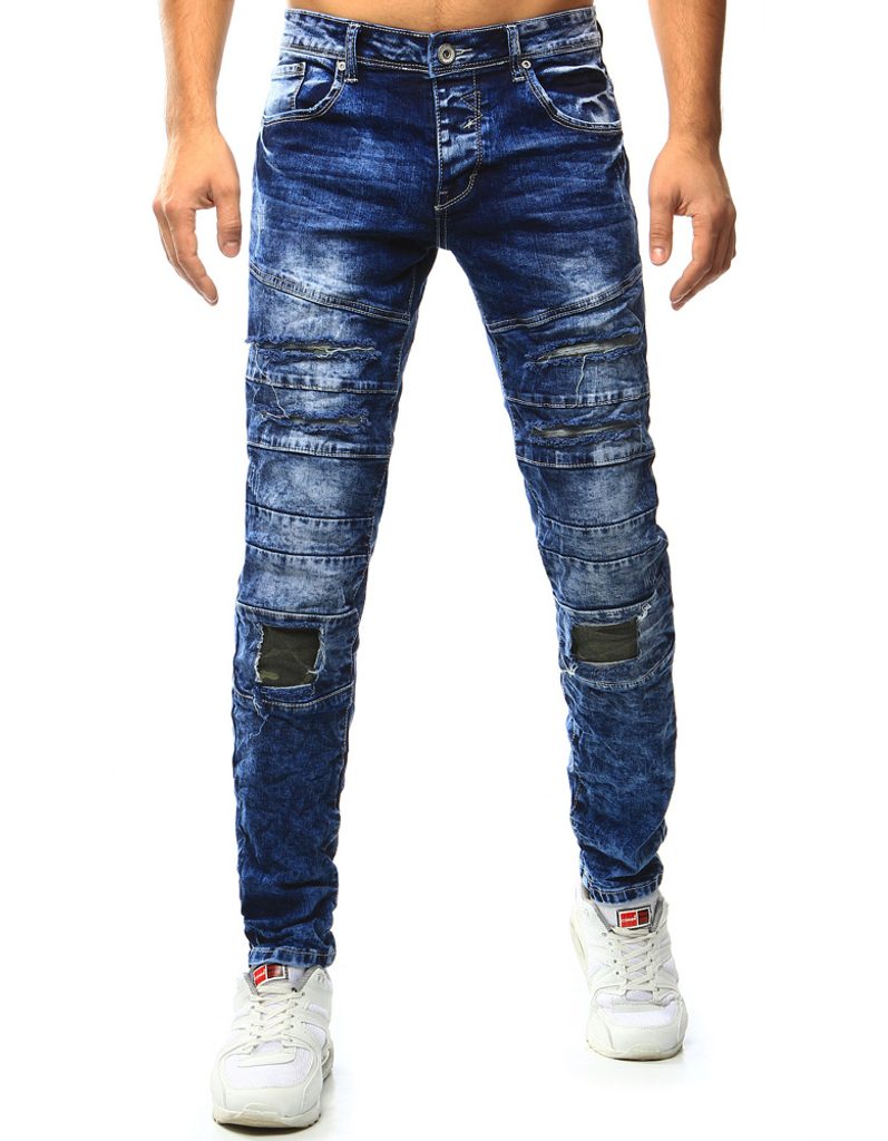 Figyelemfelkeltő, kényelmes férfi farmer. Kiváló minőségű, puha, koptatott és szakadt hatású farmerből készült, mely látványos osztó varrásokkal díszített a comb mentén. A térde foltozott. Normál derékmagasságú, alakra szabott fazon, hosszú nadrágszárakkal. Derékban integrált öv és övbújtatók, klasszikus zsebkialakítás. Elöl gombos és cipzáras rögzítés.