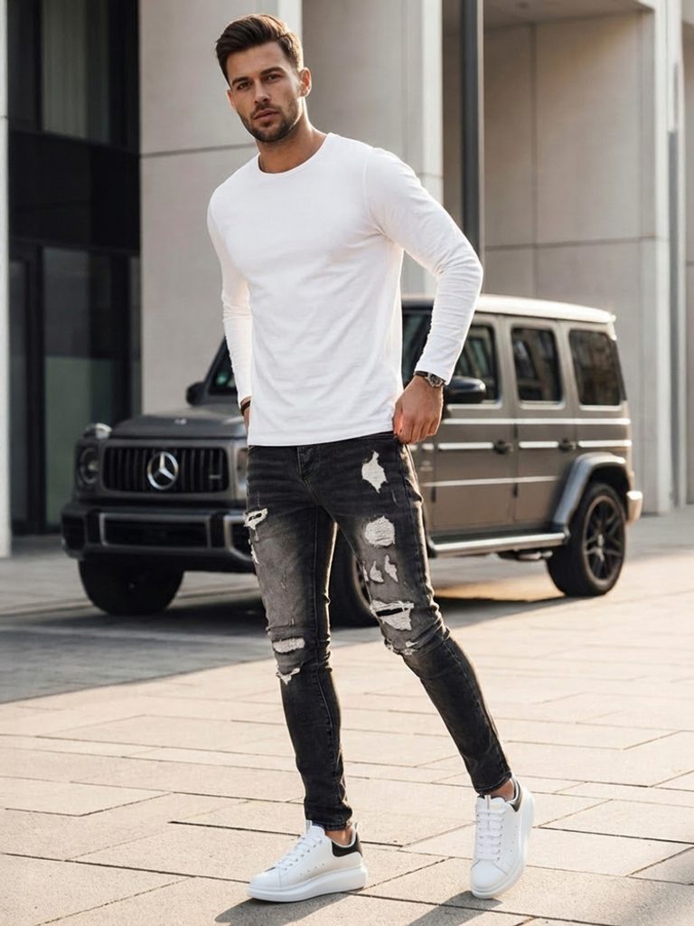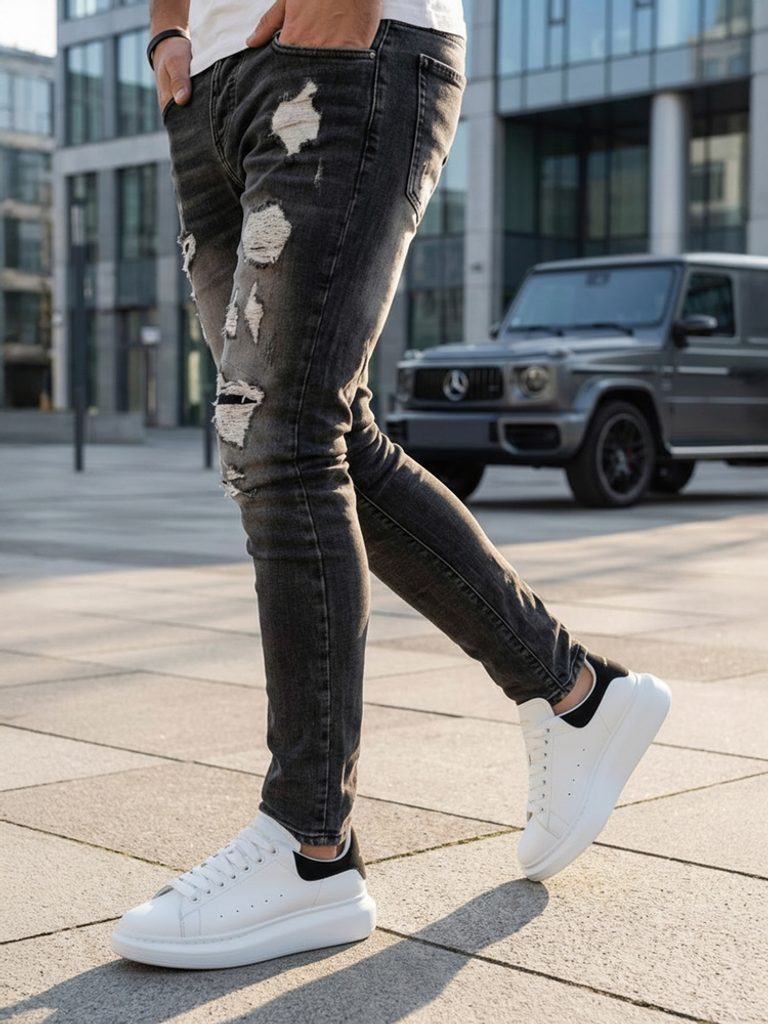 nagyszerű férfi farmer gombos rögzítés kúpos vágás díszítő karcolások, elemek három elülső zseb két hátsó zseb ideális mindennapi viseletre Anyaga: 65% pamut, 27% poliészter, 6% viszkóz, 2% elasztán