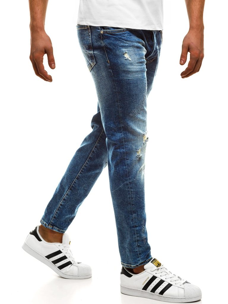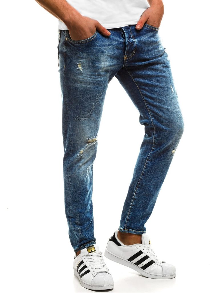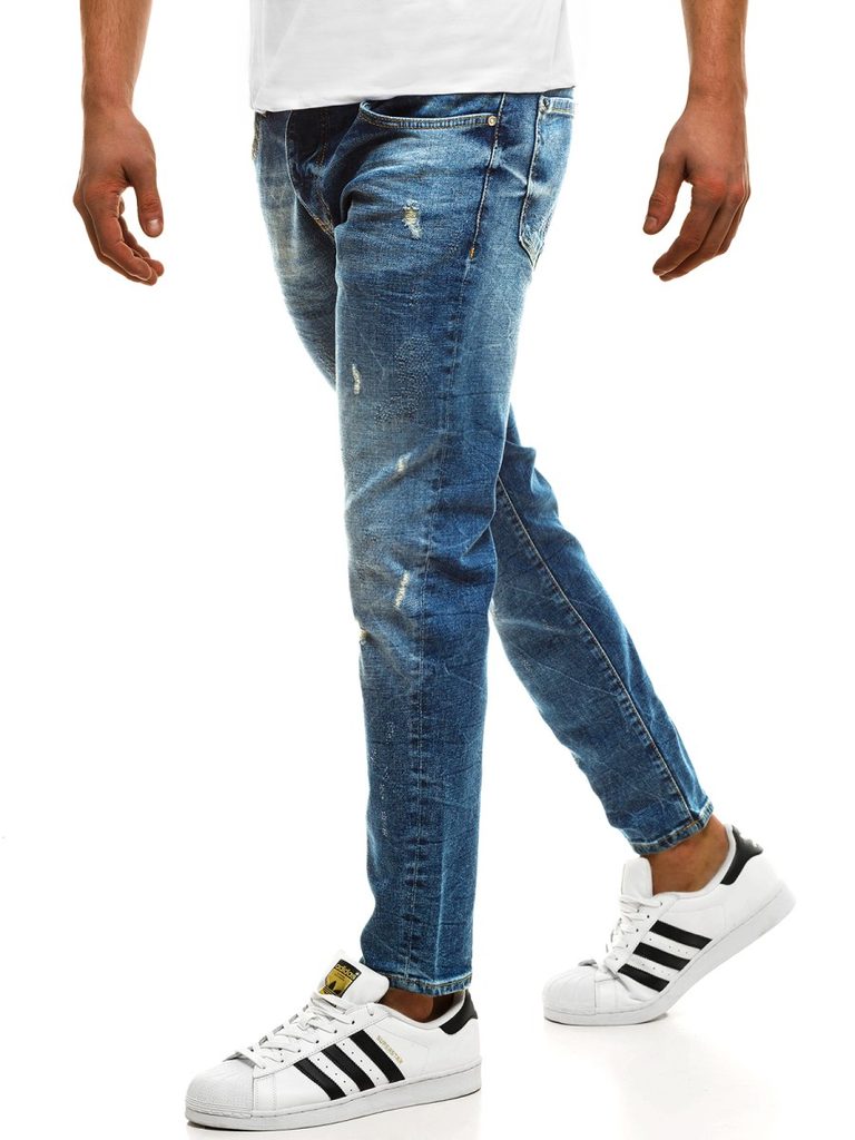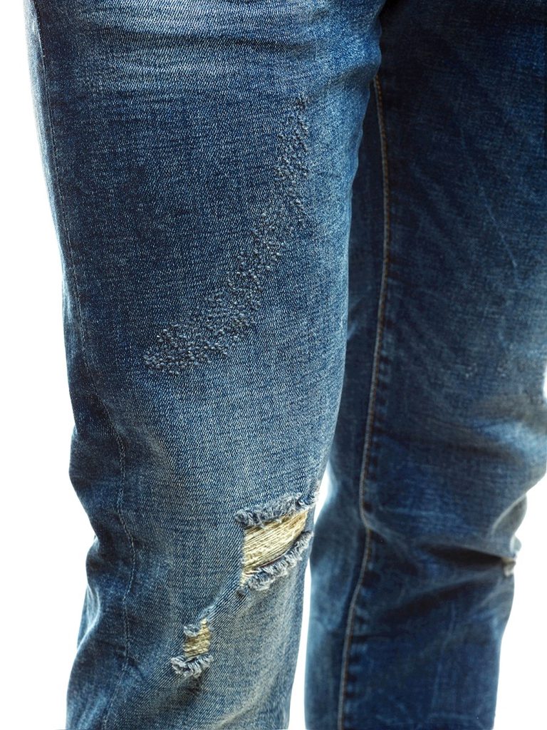Kényelmes kék koptatott farmer. Kiváló minőségű, rugalmas farmerből készült. Normál derékmagassáú, alakra szabott fazon, hosszú, enyhén a testhez simuló nadrágszárakkal. A lábszár enyhén szakadt elemekkel rendelkezik. Derékban integrált öv és övbújtatók, hátul rátett zsebek. Elöl gombos és cipzáras rögzítés, kétoldalt klasszikus zsebek.