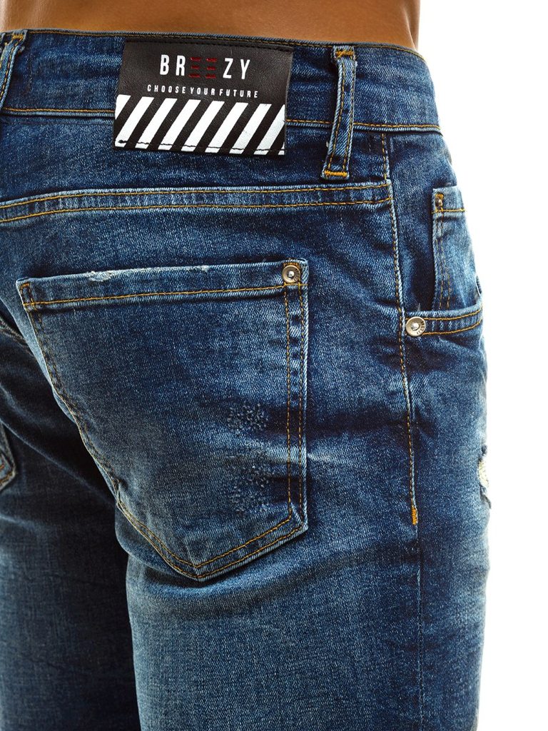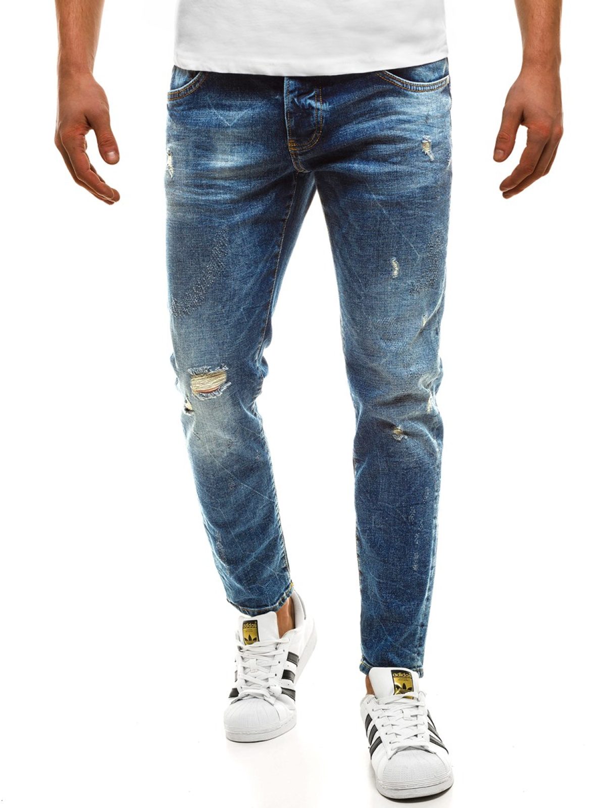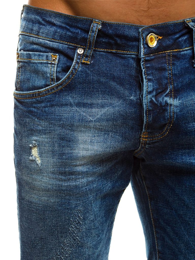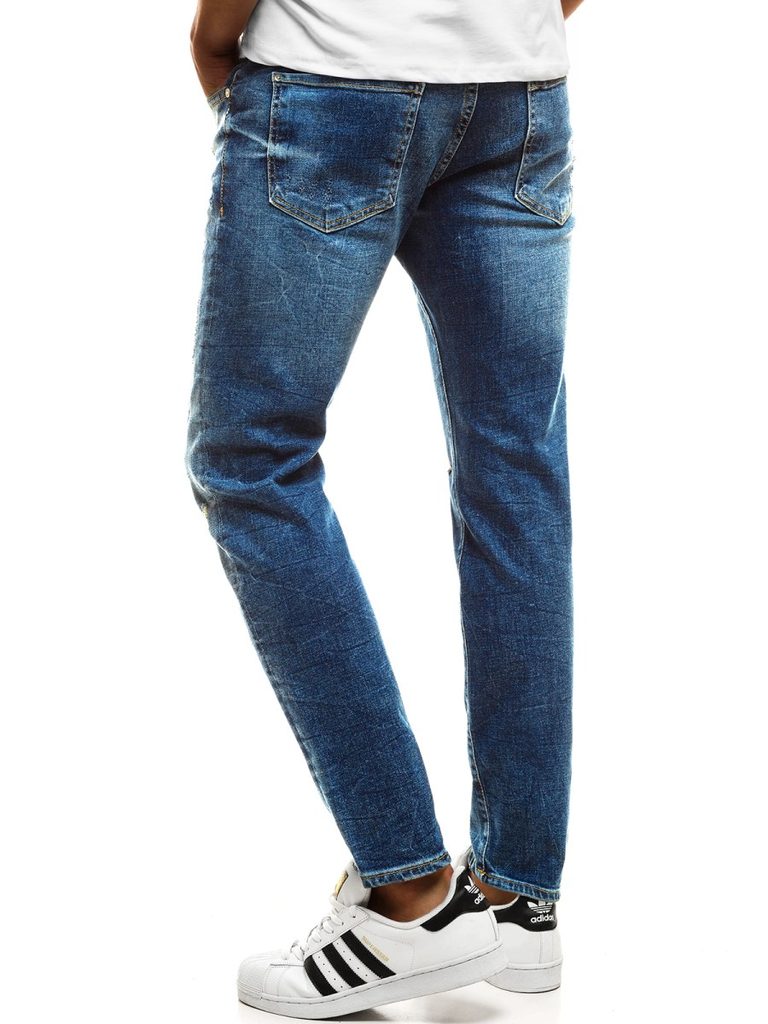 Kényelmes kék koptatott farmer. Kiváló minőségű, rugalmas farmerből készült. Normál derékmagassáú, alakra szabott fazon, hosszú, enyhén a testhez simuló nadrágszárakkal. A lábszár enyhén szakadt elemekkel rendelkezik. Derékban integrált öv és övbújtatók, hátul rátett zsebek. Elöl gombos és cipzáras rögzítés, kétoldalt klasszikus zsebek.
