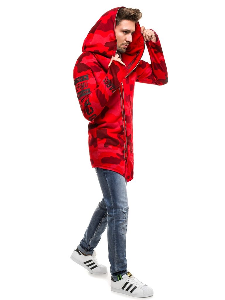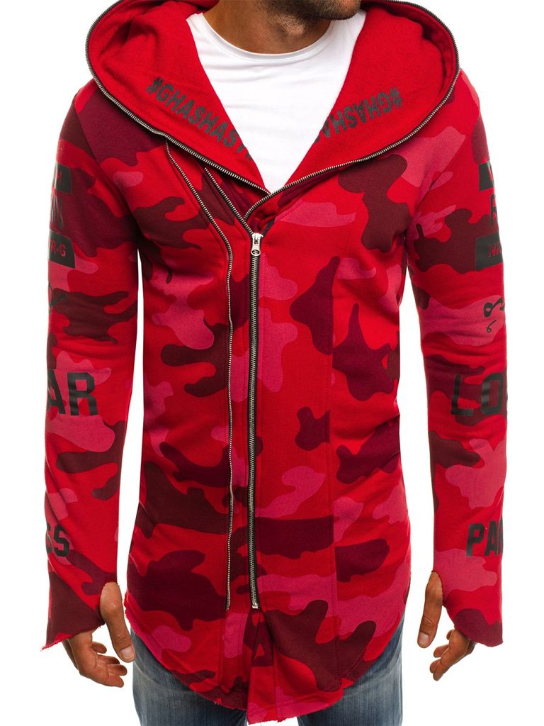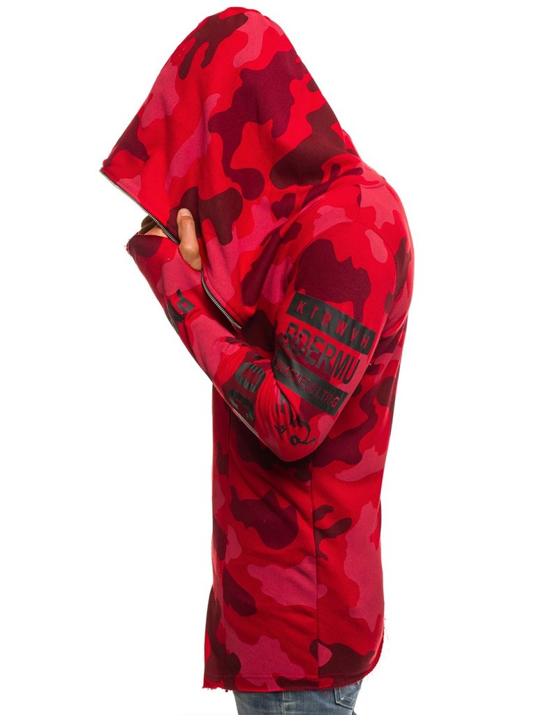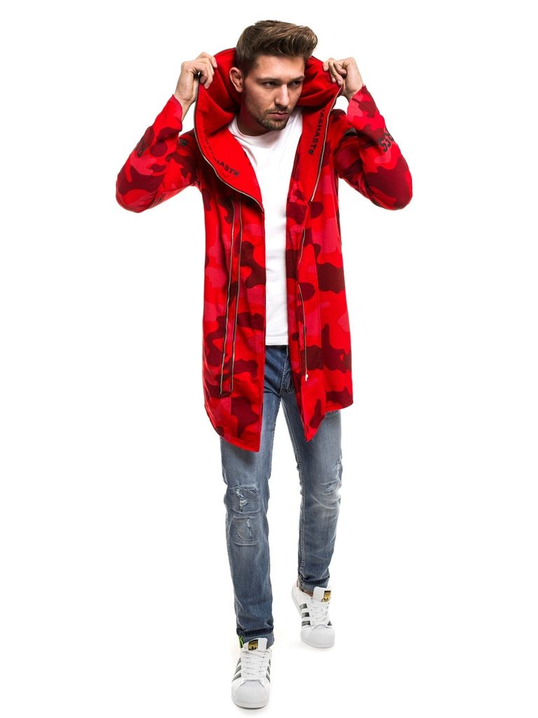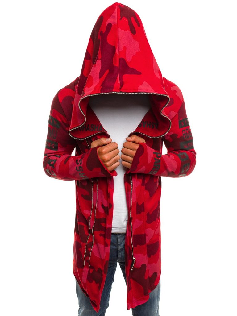Érdekes , praktikus férfi kardigán. Az eleje érdekes asszimetrikus kivitelben. Többféle felirattal és ábrával. Teljes felületén piros alapon terepmintás kivitletben. Finom tapintású, kellemes viseletet biztosító anyagból készült. Laza, cipzáros rögzítéssel. Hosszú ujjakkal. Nagy méretű, laza kapucnival. Feneket takaró hossz. Az aktuális trendeket követő, modern férfiak számára.