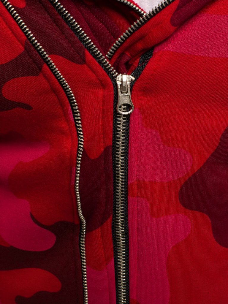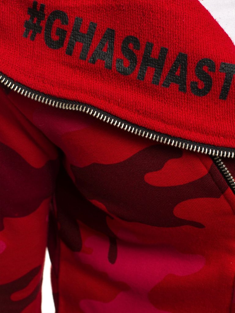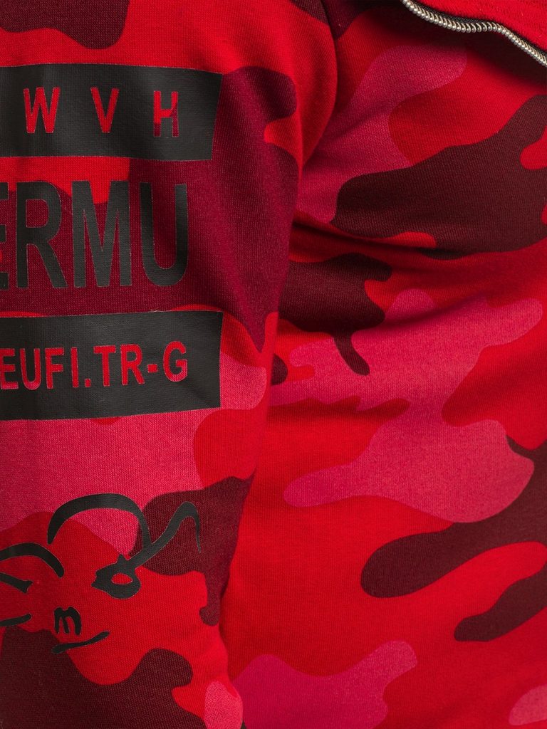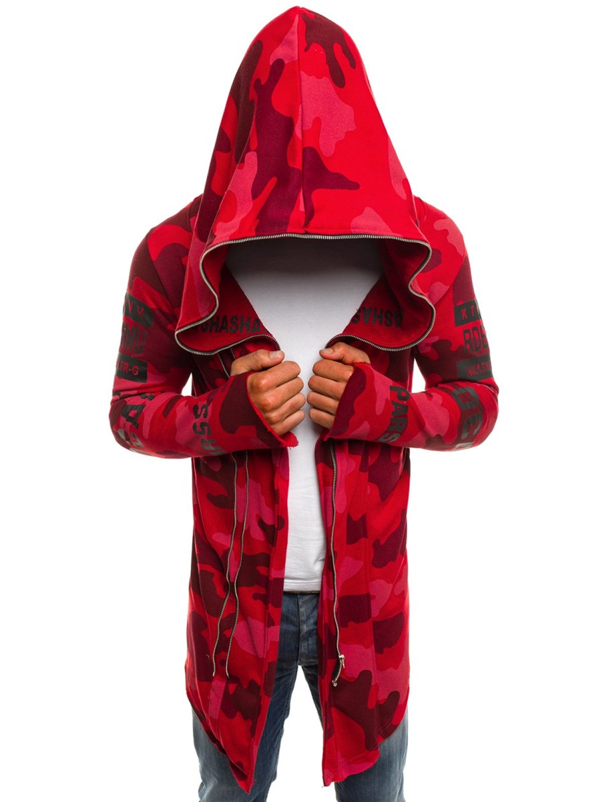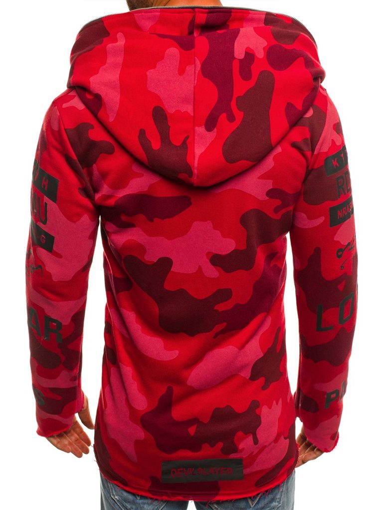 Érdekes , praktikus férfi kardigán. Az eleje érdekes asszimetrikus kivitelben. Többféle felirattal és ábrával. Teljes felületén piros alapon terepmintás kivitletben. Finom tapintású, kellemes viseletet biztosító anyagból készült. Laza, cipzáros rögzítéssel. Hosszú ujjakkal. Nagy méretű, laza kapucnival. Feneket takaró hossz. Az aktuális trendeket követő, modern férfiak számára.
