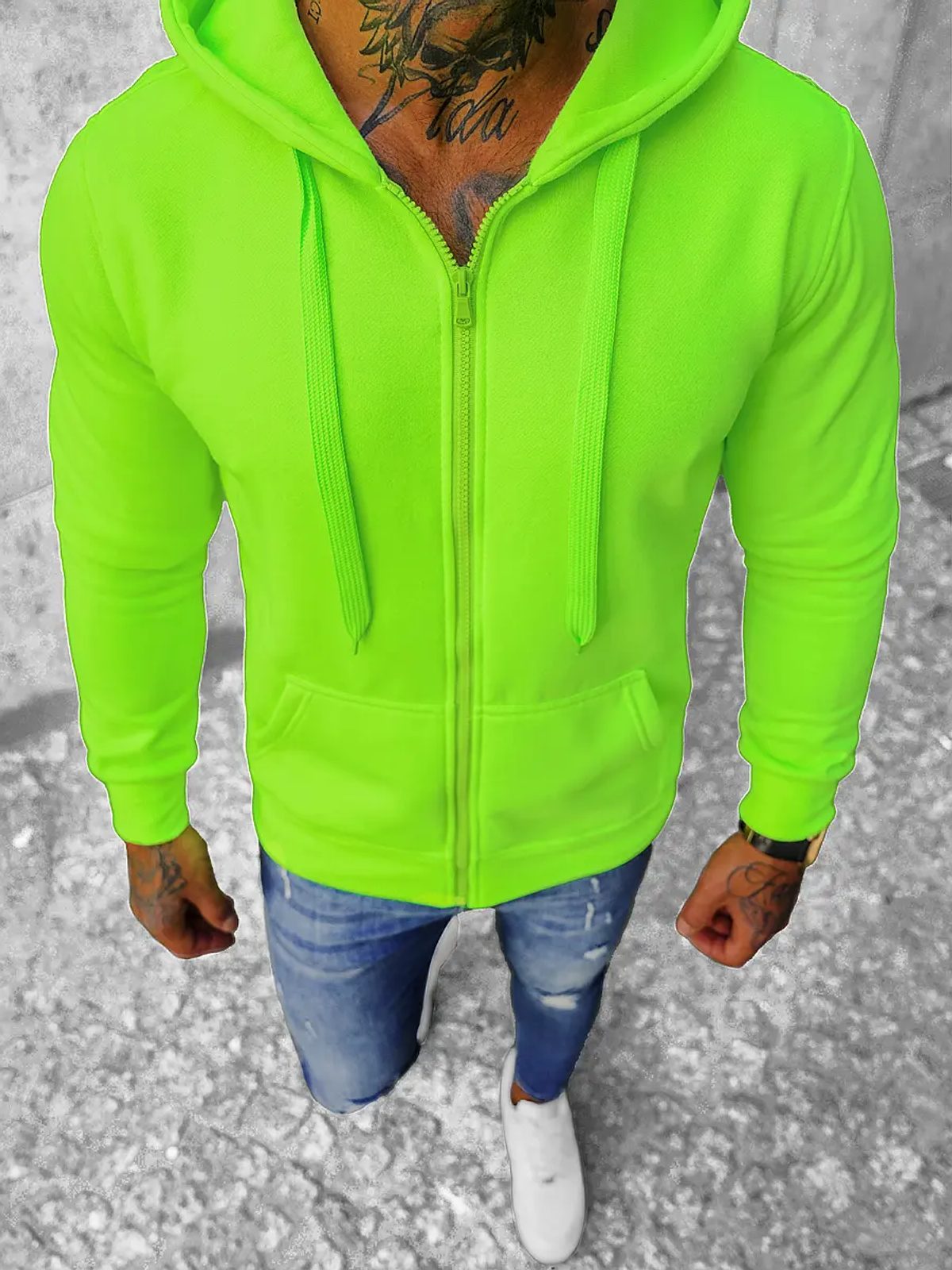 Divatos, egyszerű férfi szabadidő felső. Kapucnis modell. Két benyulós zsebbel ellátva. Kiváló minőségű, puha anyagból készült, finom tapintású. Enyhén alakra szabott, letisztult vonalú fazon, hosszú ujjakkal. Elöl cipzár rögzítéssel. Derékig érő hossz.