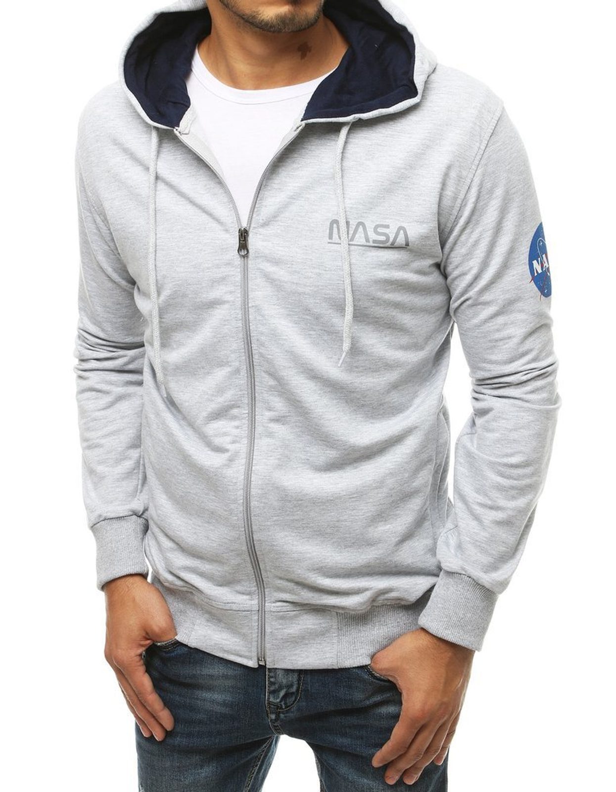 Halvány szürke kapucnis melegítő felső. Mellkas részen hímzett NASA felirattal és kar részen egy NASA logós címke található. Cipzáros rögzítéssel. Az ujjak és a derékrésze rugalmas passzéval ellátva. Kapucnis modell. A kapucnis belső része sötét kék színben. Két oldalsó zsebbel rendelkezik. Minőségi eldolgozású, hétköznapi viseletre alkalmas.