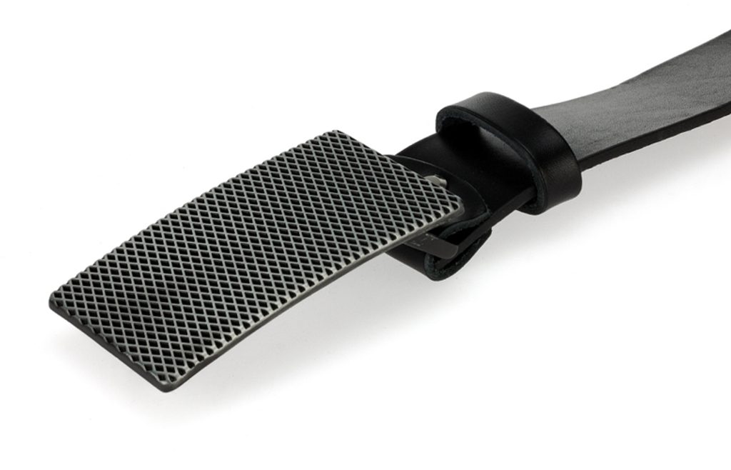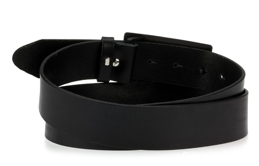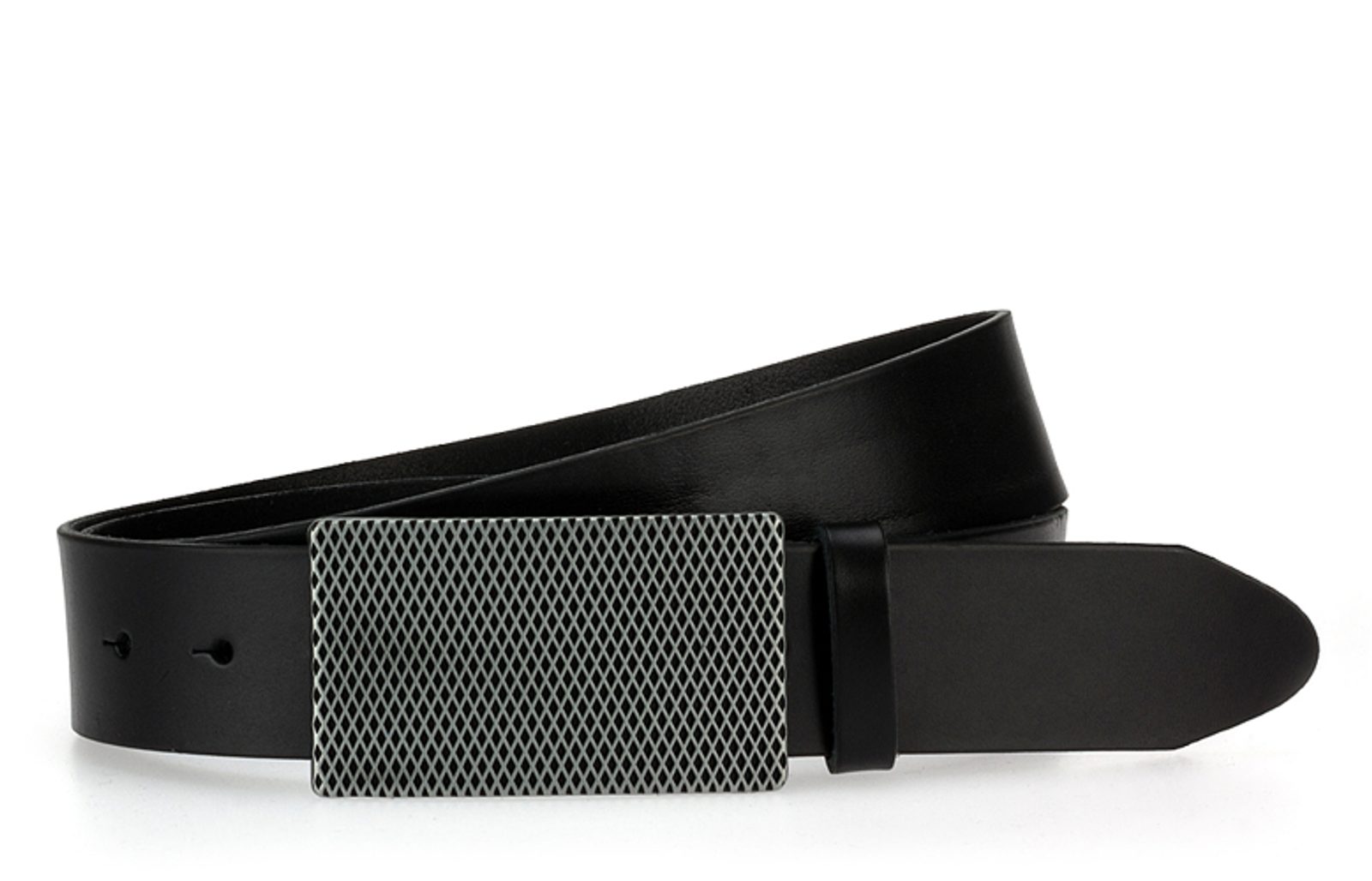 Fekete bőr férfi csatos öv. Dekoratív rejtett csat mintás díszítéssel. Sima bőrből.