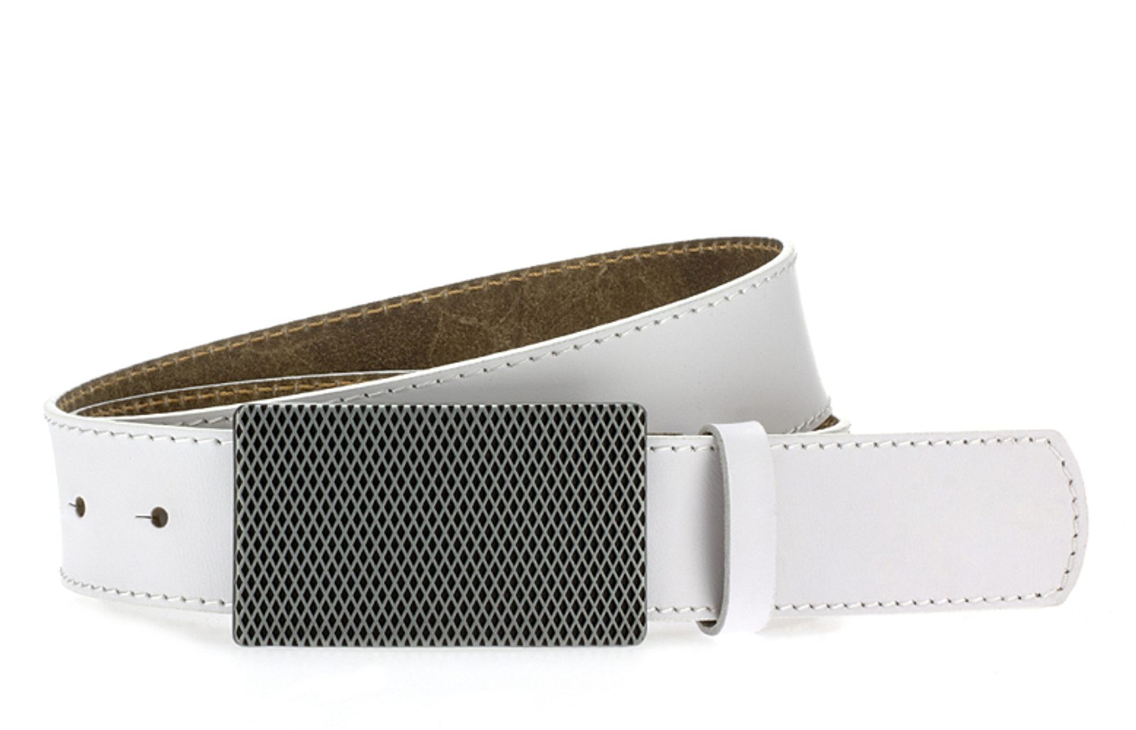 Fehér bőr csatos férfi öv. Dekoratív csat mintás díszítéssel. Sima felűletű bőrből. Az öv nagysága megfelel a derék bőségnek.