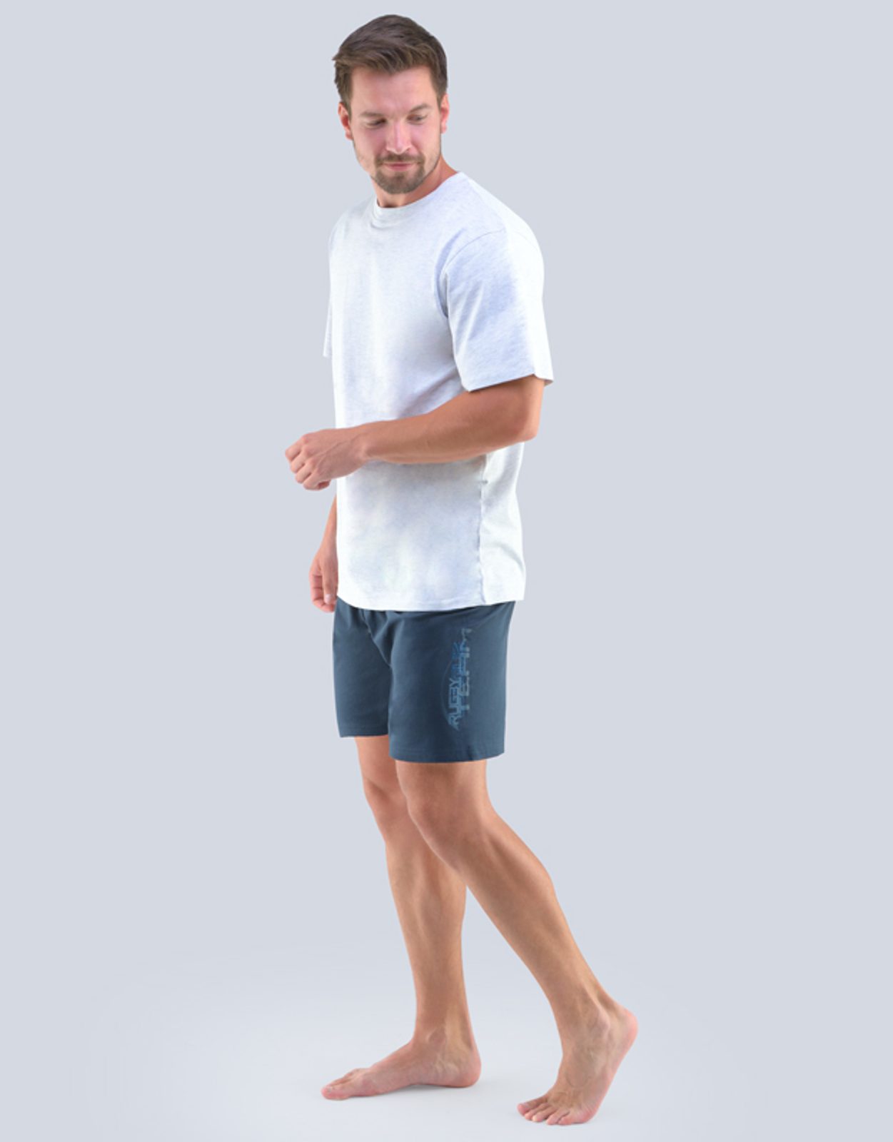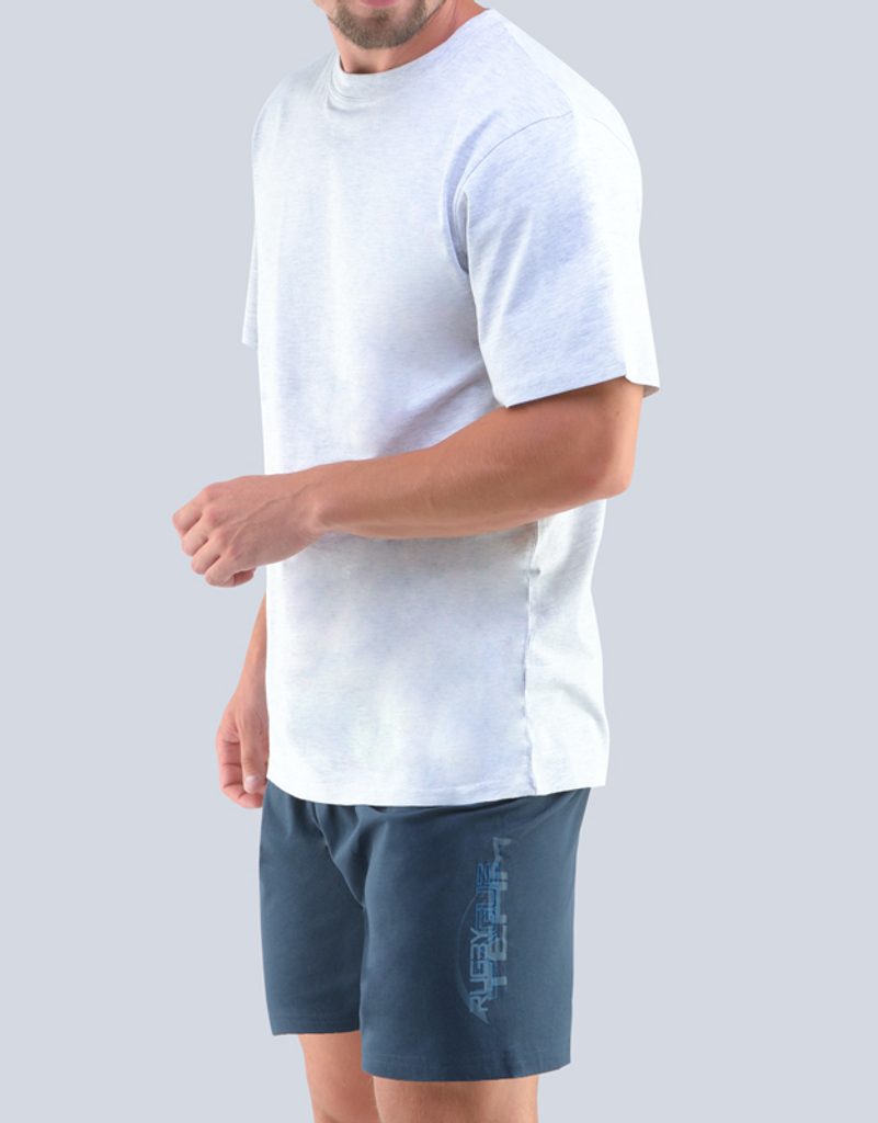 Kéynelmes férfi pizsama szett. Rövid ujjú felső résszel. Belebújós kerek nyakkivágású felső. Az alsó része, kényelmes gumírozott derékrésszel szolgál. Mindenki számára alkalmas, aki természetes anyagokat keres. Az ilyen anyagból készült pizsamák alkalmasak mindennapi viseletre.