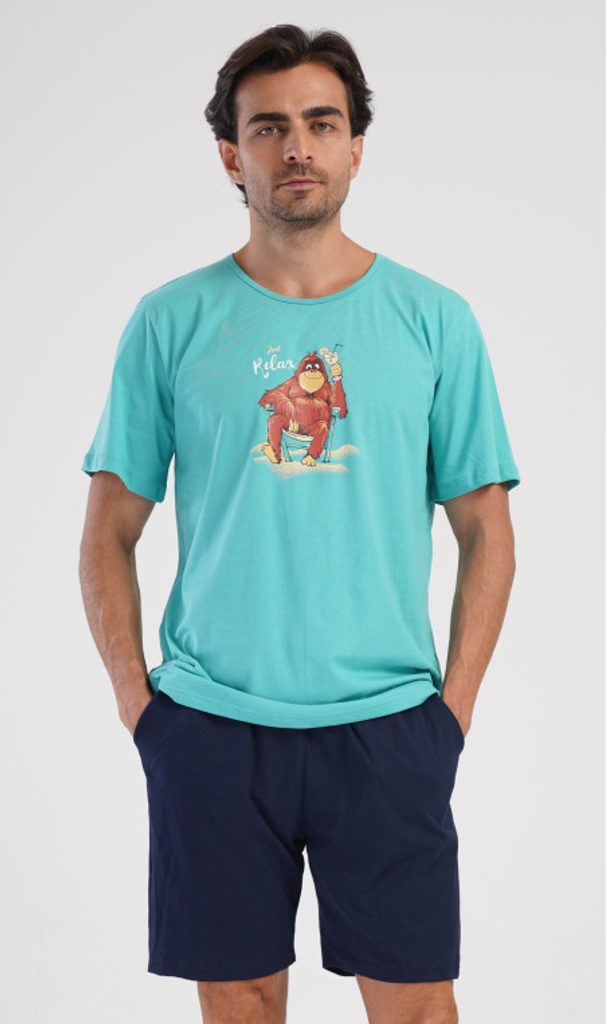 A pizsama pamutból készült. A kötöttáru azok számára alkalmas, akik természetes anyagokat keresnek. Az egyszínű, kerek nyakú pólón egy itallal pihenő majmot ábrázoló nyomat található. A rövidnadrág zsebekkel, elasztikus derékpánttal és húzózsinórral rendelkezik. Ajándéknak is alkalmas azoknak, akik szeretik a zenét.