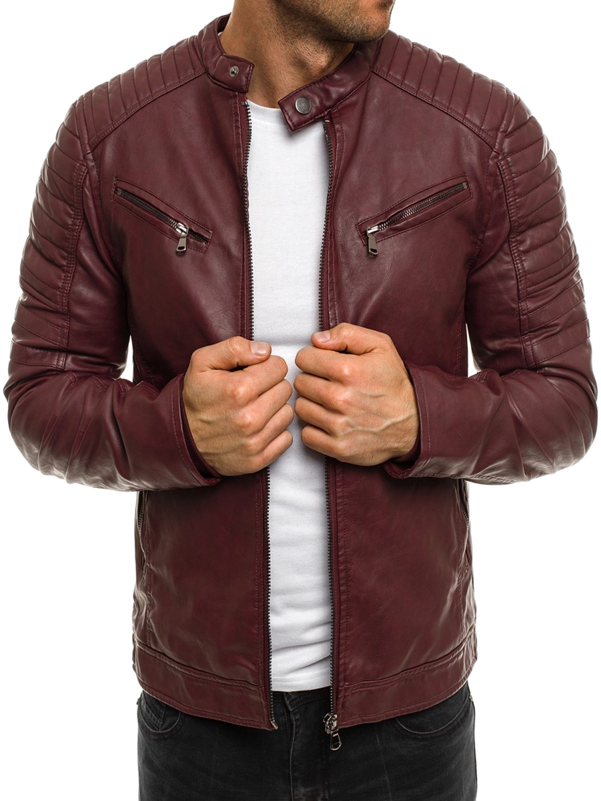 Motoros stílusban. Bordó műbőrből. A vállon, a felsőkaron és a hátsó szegélyen steppelt részletek. Végigfutó cipzár kis állógallérral. Cipzáras mellzsebbel. Kényelmes fazon. Cipzáras záródással.