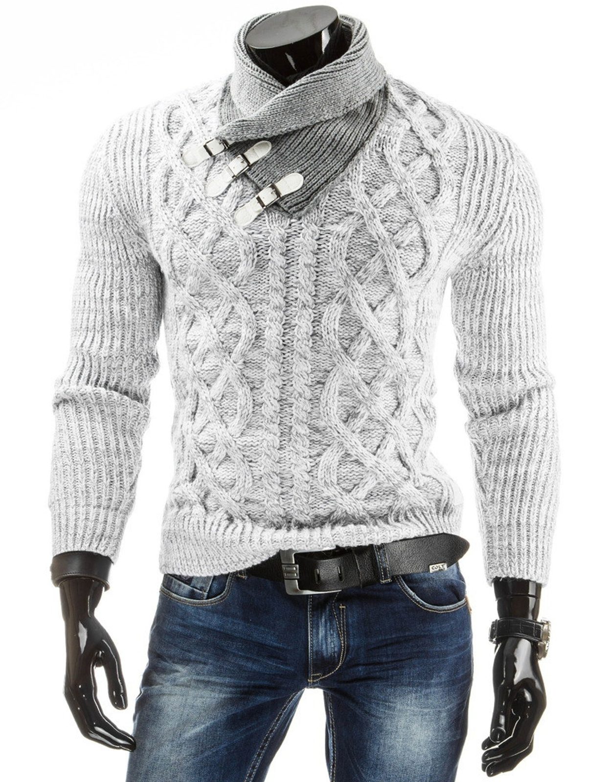 Féhér kötött férfi pulóver. Divatos kötés mintával. Magas nyak, mely csatos gombolással divatossá teszi ezt a modellt. A ujjak valamint a derékrésze szegéllyel. Meleg, kényelmes pulóver.