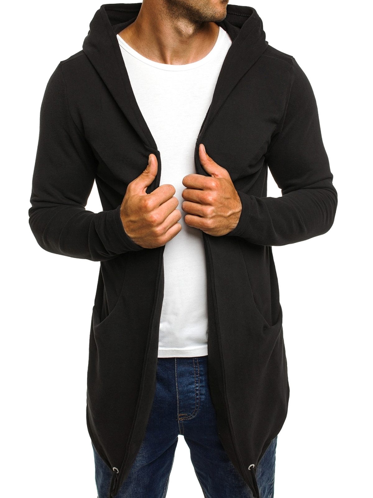 BREEZY fekete férfi hosszú kardigán. Sportos kivitelben. Kapucnis fazon, két oldalsó zsebbel. Az alja szinórbehúzással allítható. Megfelel a hideg őszi napokra. Egyszínű pólóval és egy farmernadrággal tökéletes megjelenést biztosít viselőjének. Kényelmes pamut anyagból készült.