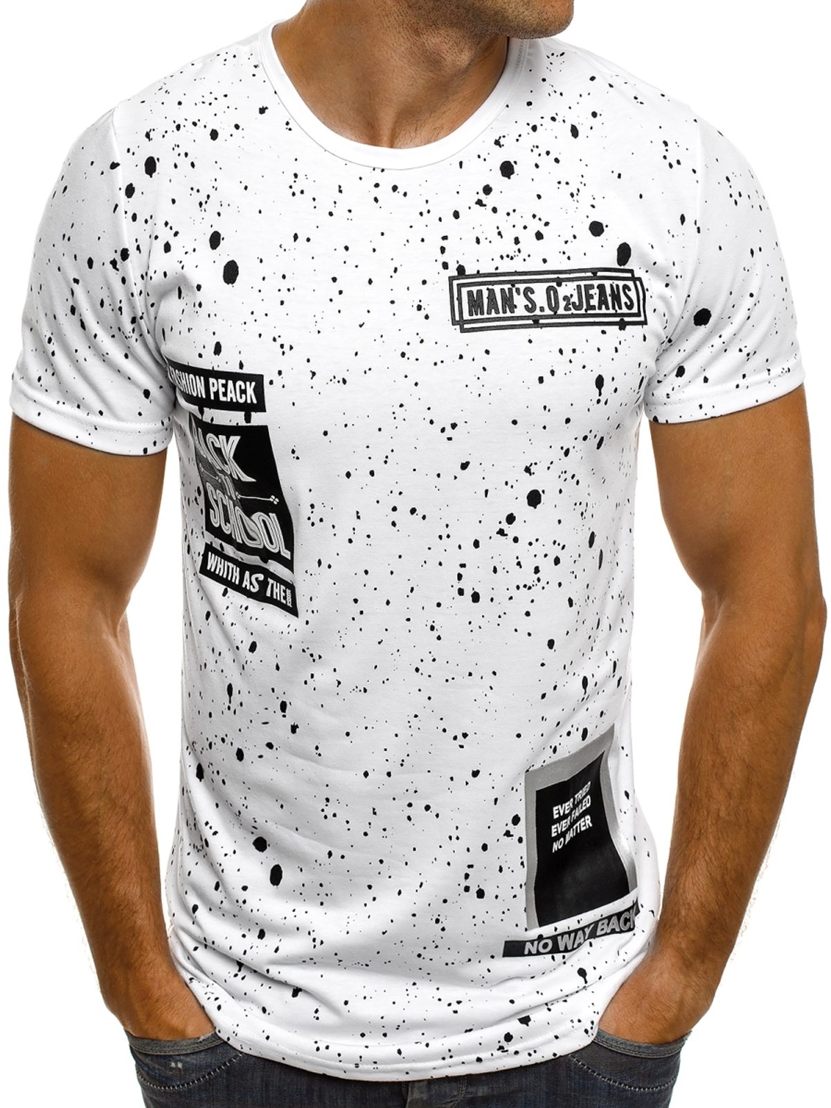 Látványos, modern férfi felső, figyelemfelkeltő, festék fröcskölt mintával, fehér alapon . Kiváló minőségű, puha, rugalmas anyagból. Egy mell zsebbel rendelkezik. Klasszikus, enyhén testhezálló fazon, kerek nyakkivágással és rövid ujjakkal. Csípőig érő hossz.
