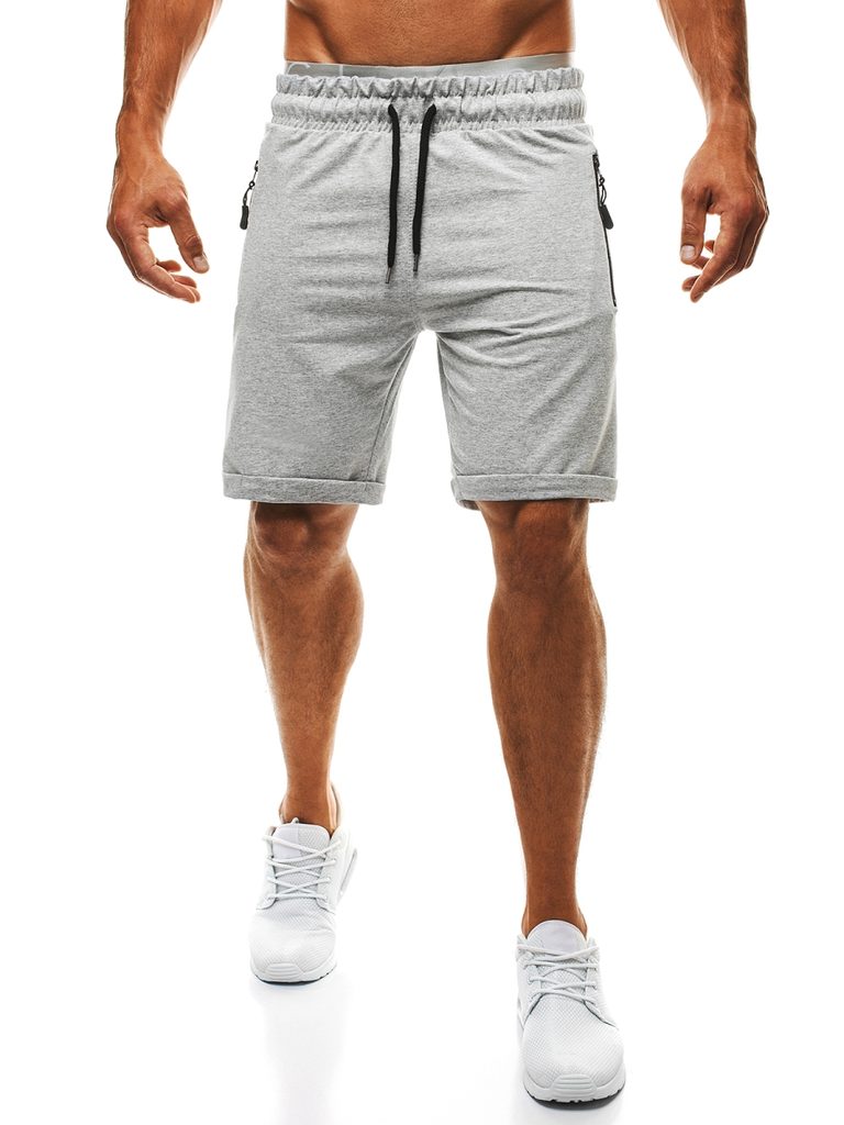 Világos szürke színű, férfi melegítő rövidnadrág, szürke gumival a derekán. Fekete derékmadzag, amely színben harmonizál a rövidnadrág színével. Az oldalán két zseb, fekete cipzárral. Hátulján szintén zseb található.