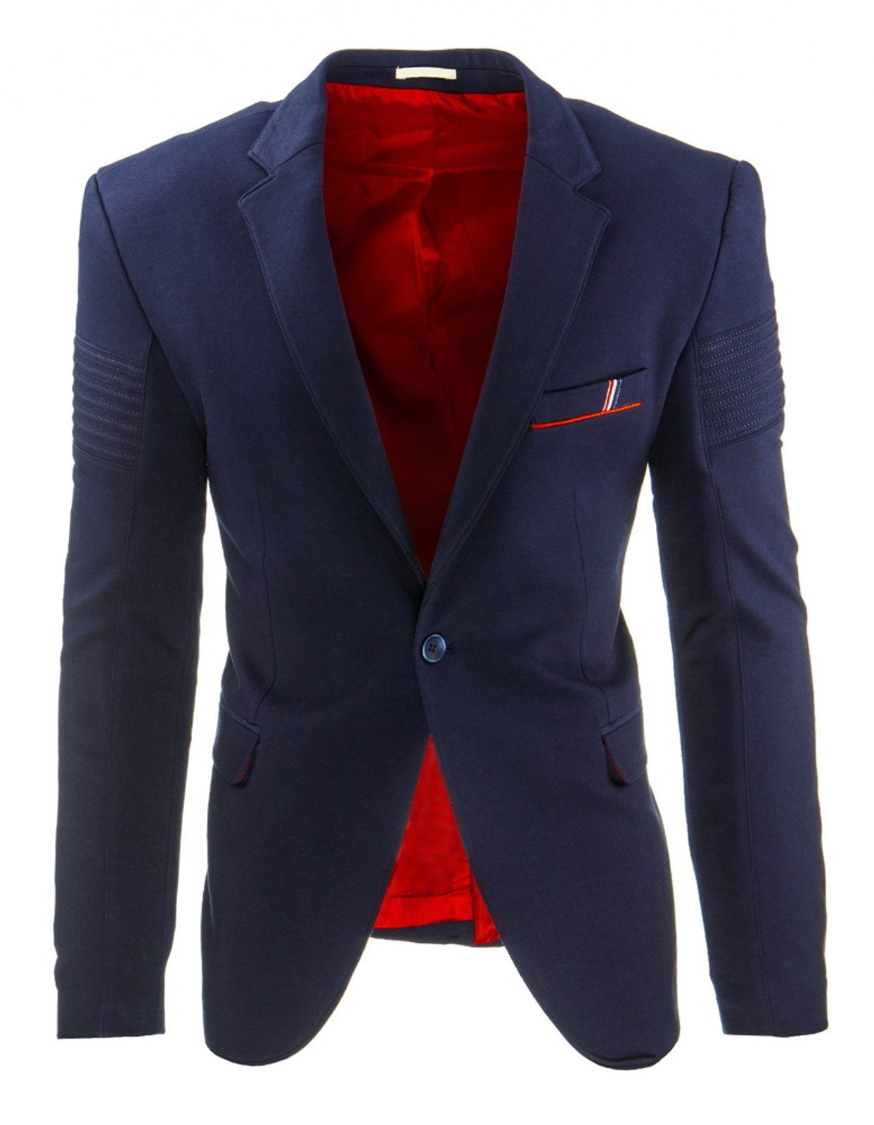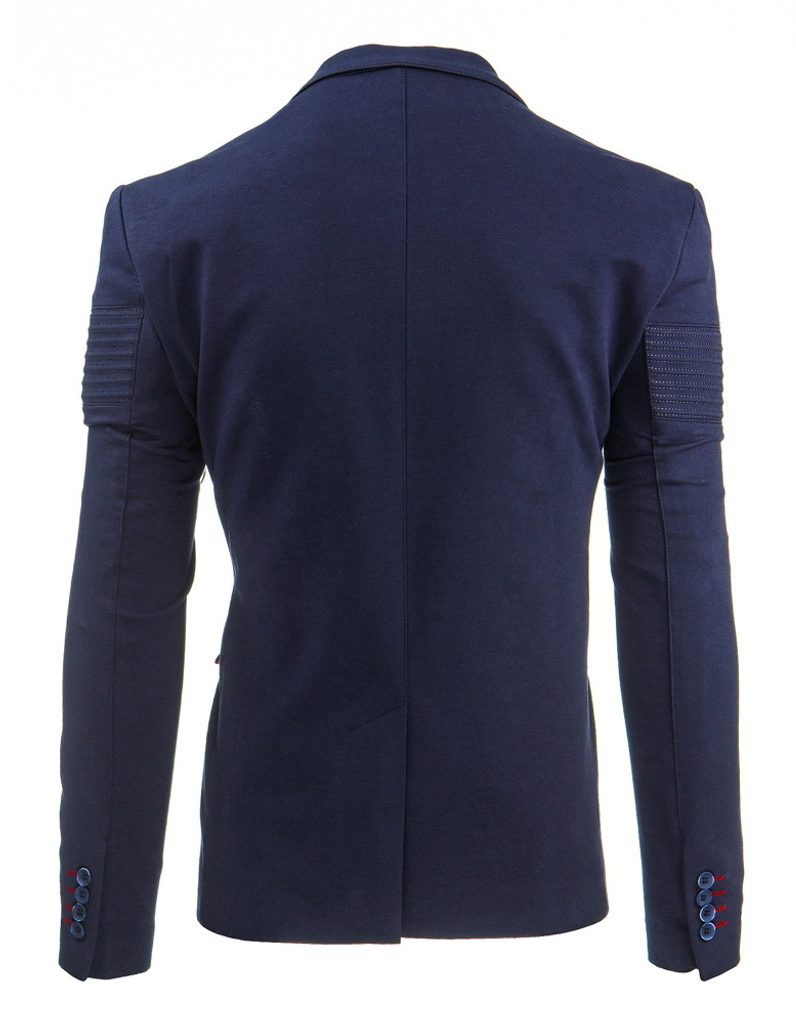 Egyedi férfi zakó. Modern szabásvonal, amely jól illeszkedik minden alakhoz. Két külső és két belső zsebbel. Egy díszített mell zseb. A kar része stílusos varrásal díszítve. Egy gombbal való gombolás. Felejthetetlen megjelenést biztosít viselőjének. Elegáns zakó. Sötét kék színben.