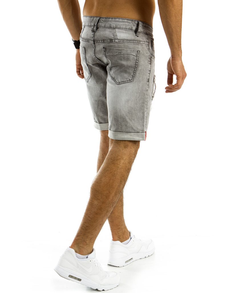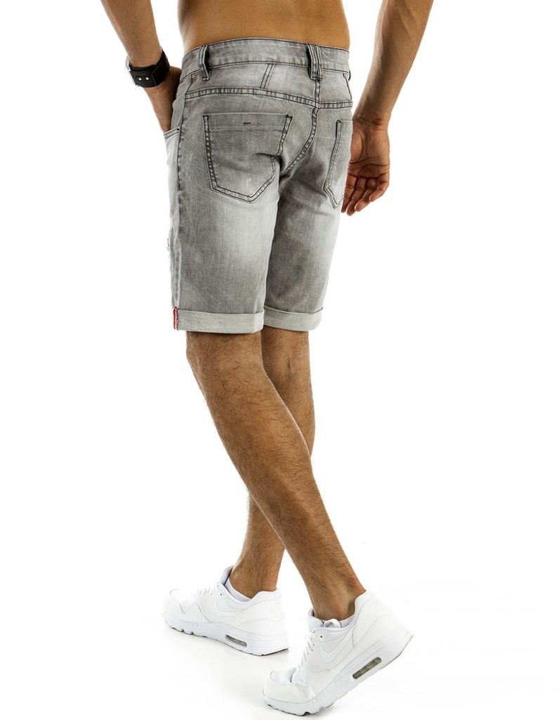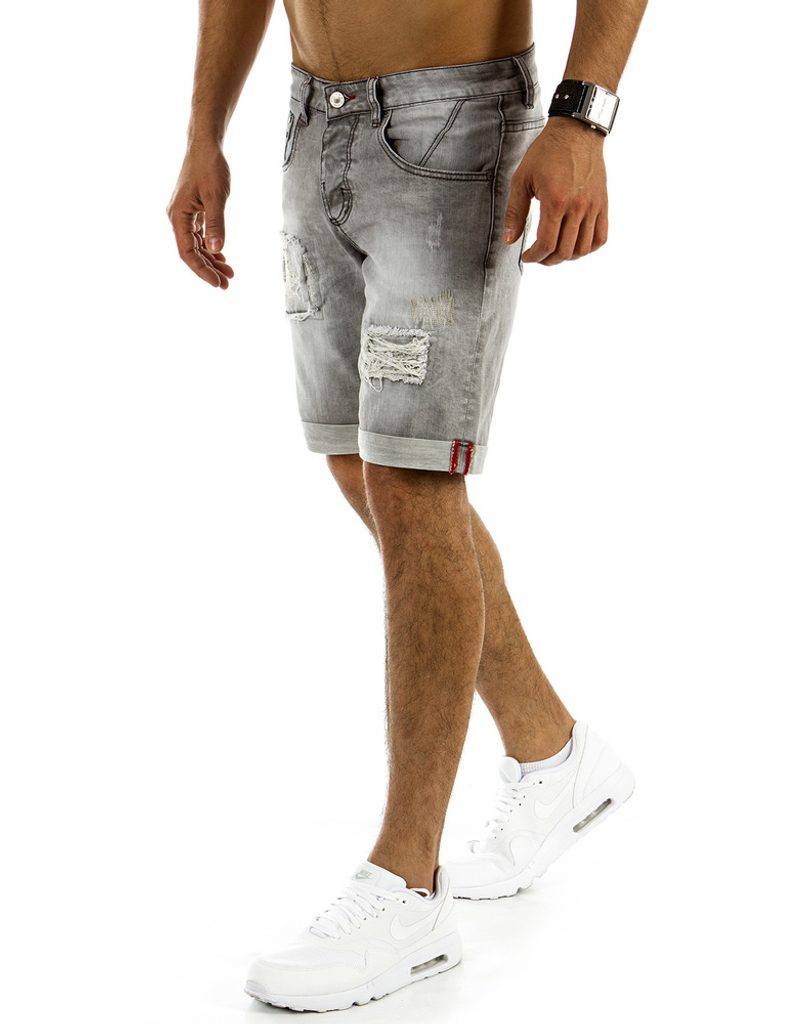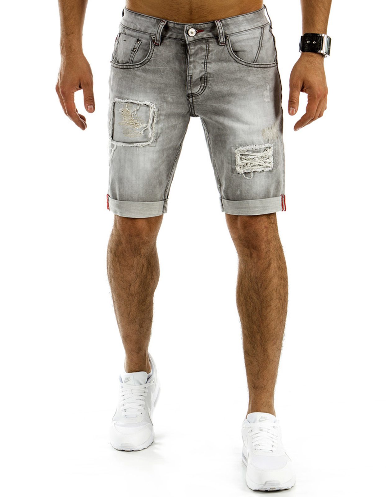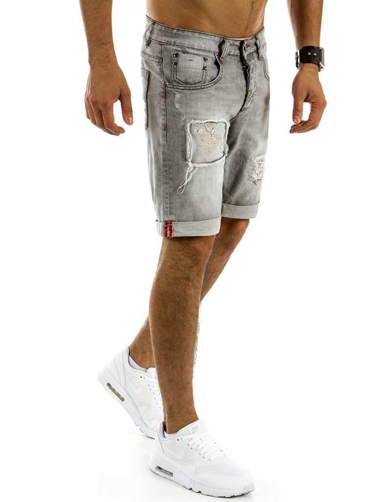 Divatos, fiatalos szűk szárú rövid farmer. Szürke színben. Rugalmas, puha, divatos koptatott és szakadt hatású farmerből készült. Normál derékmagasságú fazon, lefelé szűkűlő lábszárakkal. Aszimmetrikusan elhelyezett, különböző nagyságú tépett részek díszítik. Derékban integrált öv, övbújtatók, klasszikus zsebkialakítás. Gombos és cipzáras rögzítés.