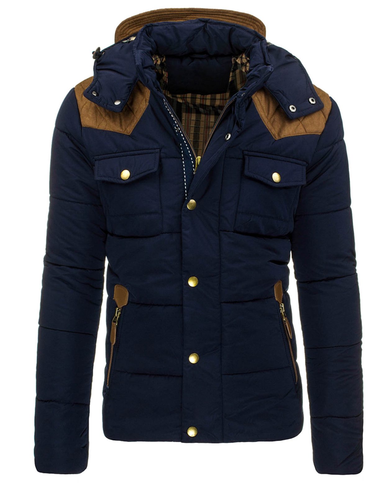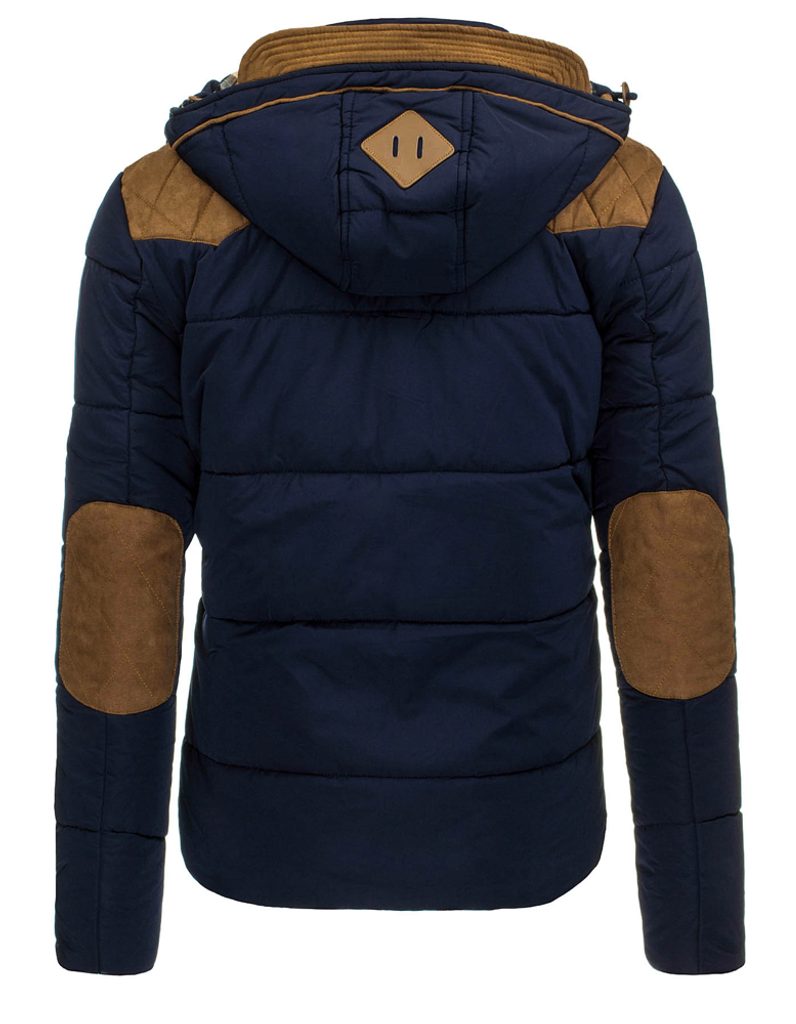 Divatos téli sötét kék kabát. Minőségi eldolgozású. Nagyon megfelelő viselet a hideg téli időszakra. Komfortérzetet nyújt viselőjének. Kapucnis fazon, mely barna színű elemekkel van díszítve ugaynúgy a váll része a kabáítnak is. barna könyök foltozással ellátva. Rejtett cipzáral ellátva. Kívül patent gombokkal ellátva. Két oldalsó zsebbel, melyek cipzárral záródnak. A mell részén dísz zsebek találhatók.