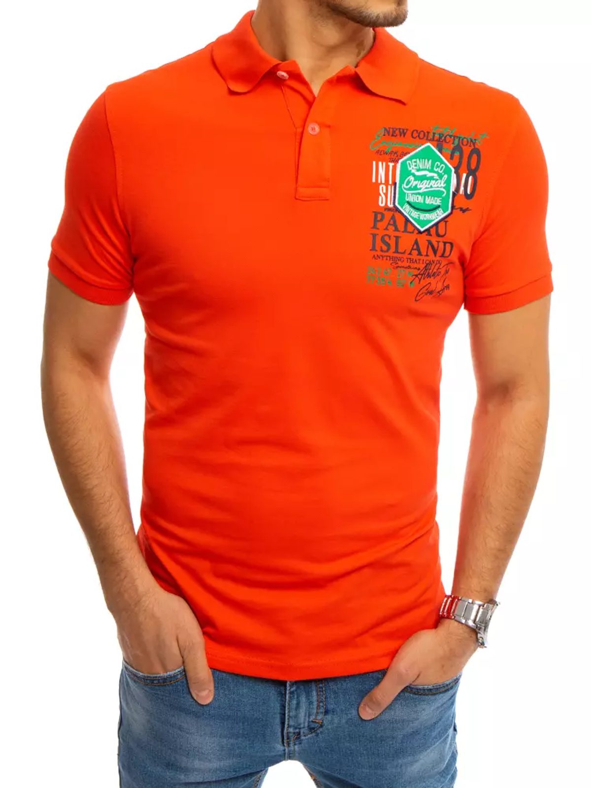 Látványos korall piros galléros póló. Mellkas részén hímzett felirat és címke. Kényelmes pamut anyag. Klasszikus kihajtott gallér, rövid gombolás pánt. Jól kombinálható.