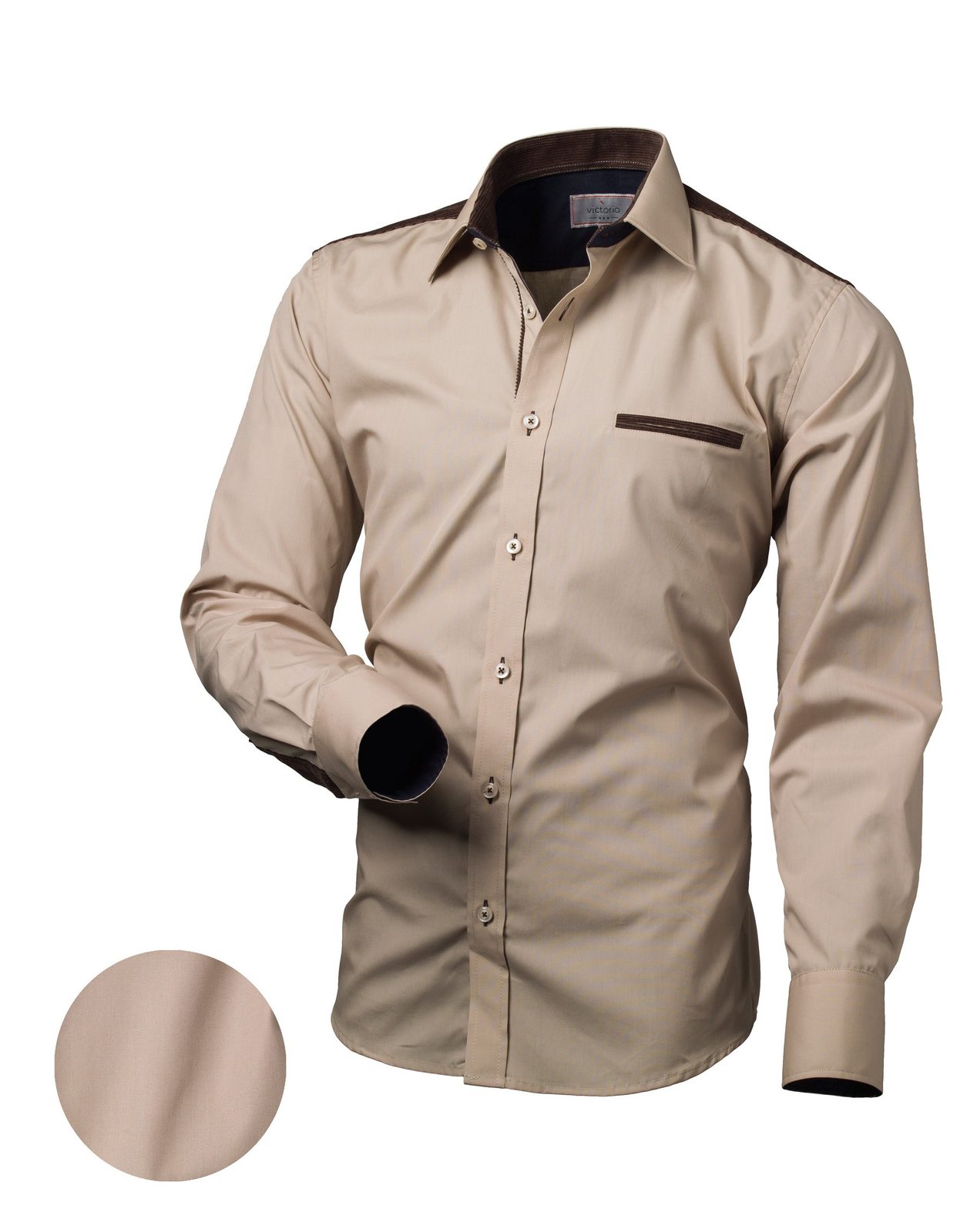 Egyedi férfi ing, amelyet halványbarna színe es a váll, zseb valamint ujjrészen található szegélye tesz különlegessé. A slim fit szabás tökéletesen kiemeli az alakot. Anyagát tekintve kényelmes viselet egész napon át. Ez az ing nem hiányozhat egyetlen férfi ruhatárából sem. Tökéletesen alkalmas bármilyen társasági eseményre. Viselhető öltönnyel, de akár farmerrel is.