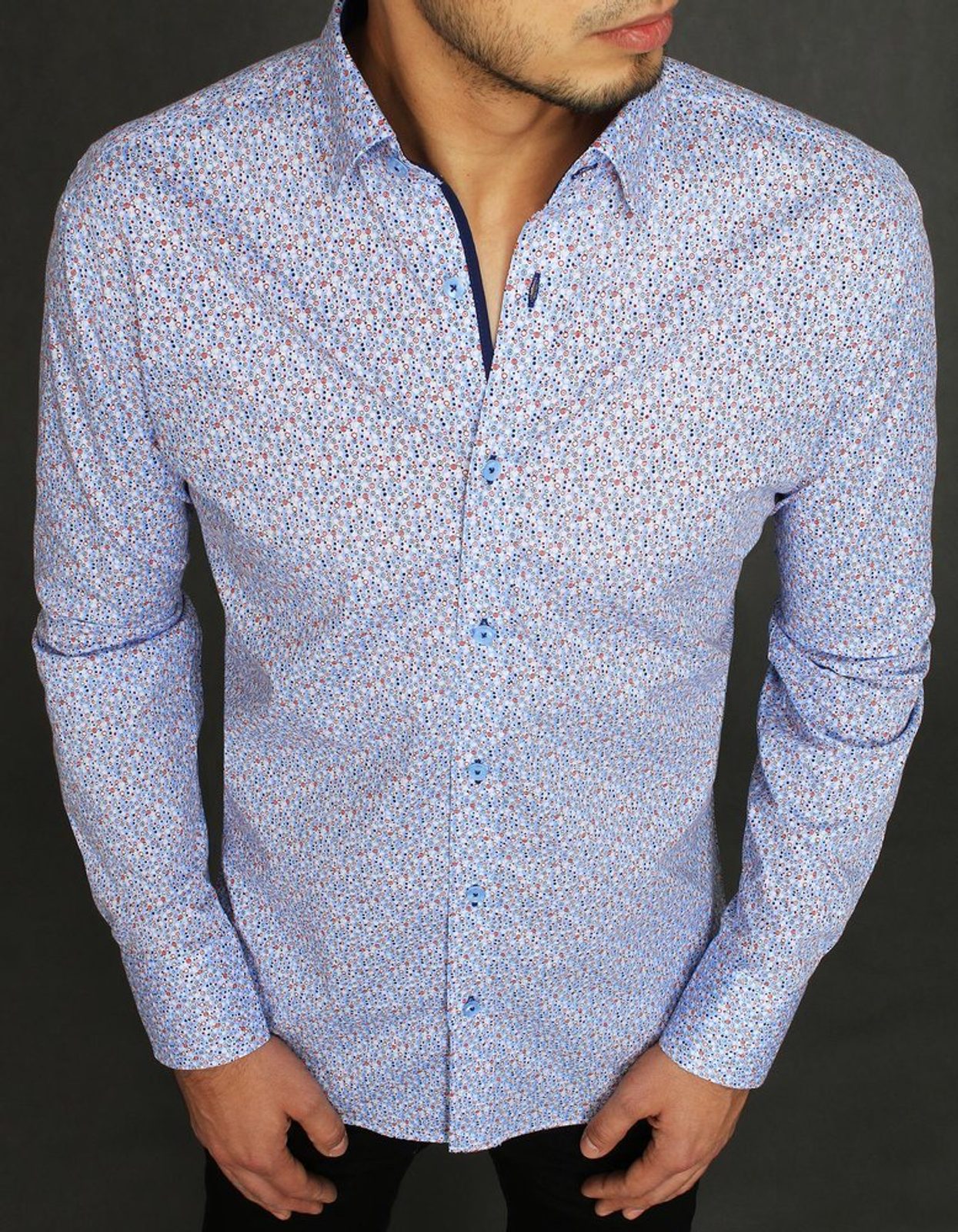 Halvány kék ing apró mintával karcsúsított SLIM FIT fazonú hosszú ujjú ing divatos vonalvezetéssel. Pamut anyagának köszönhetően nagyon kényelmes viseletet biztosít. Alakra szabott fazon, keskeny gallérral, visszahajtva viselhető ujjakkal. A mellvonalon zseb nélkül. Klasszikus gombolással. Button down gallér.