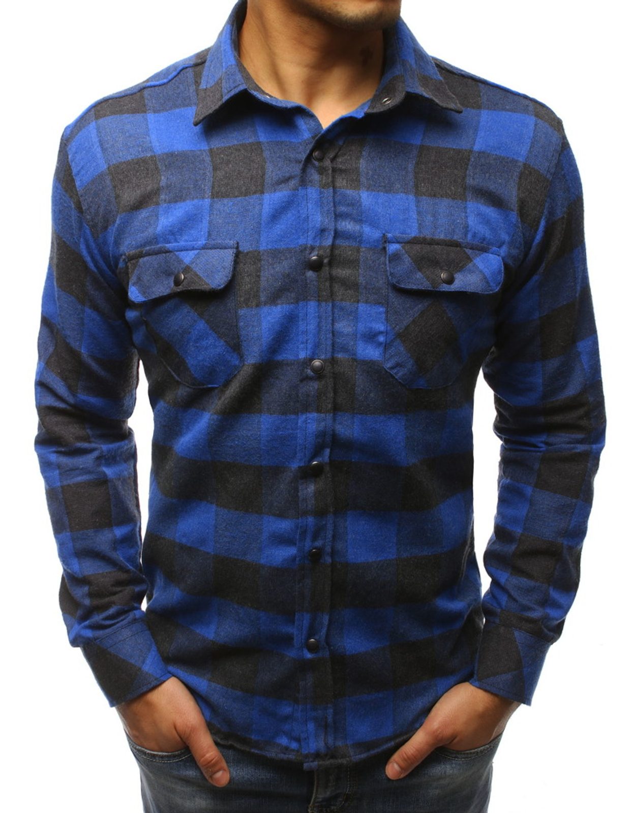 Figyelemfelkeltő kockás mintás ing, kontrasztszínű kék fekete kockás mintás kivitelben. Kiváló minőségű, puha pamut anyagból. Klasszikus, enyhén testhezálló fazon, és hosszú ujjakkal. Az allja enyhén lekerekített. Két mell zsebbel rendelkezik. Csípőig érő hossz.