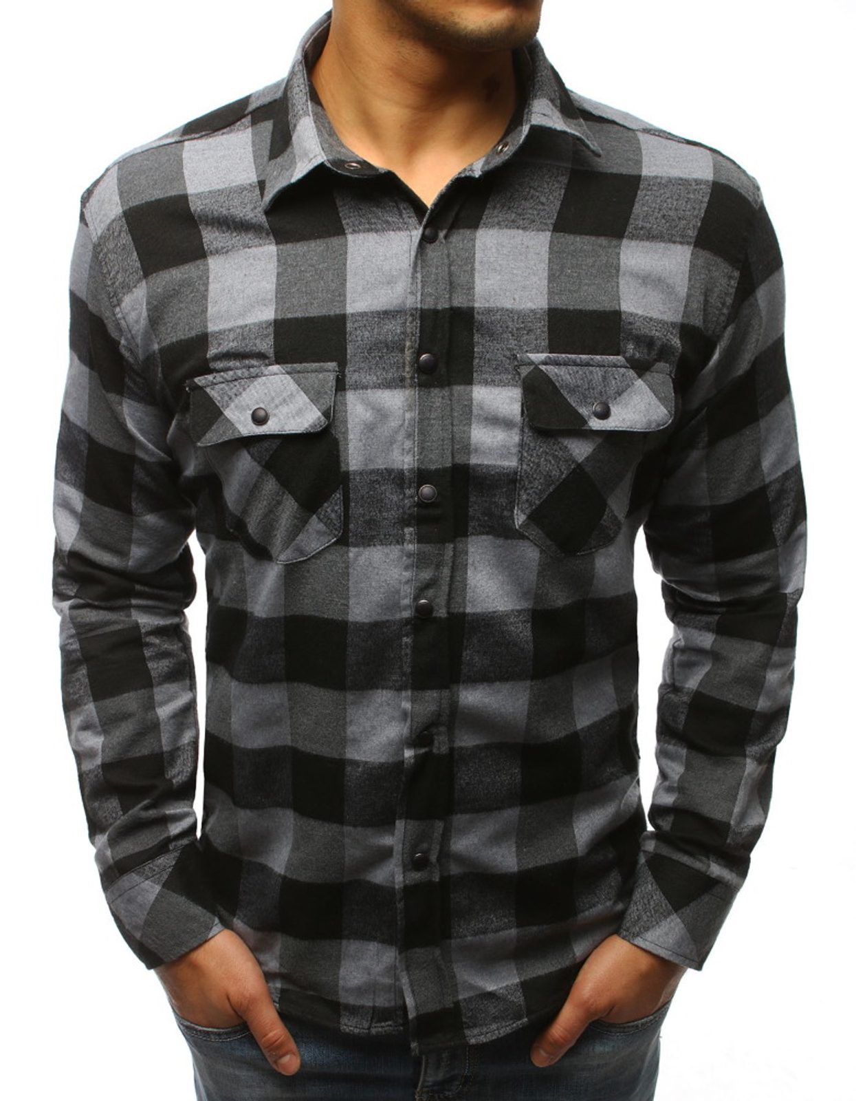 Figyelemfelkeltő kockás mintás ing, kontrasztszínű szürke fekete kockás mintás kivitelben. Kiváló minőségű, puha pamut anyagból. Klasszikus, enyhén testhezálló fazon, és hosszú ujjakkal. Az allja enyhén lekerekített. Két mell zsebbel rendelkezik. Csípőig érő hossz.