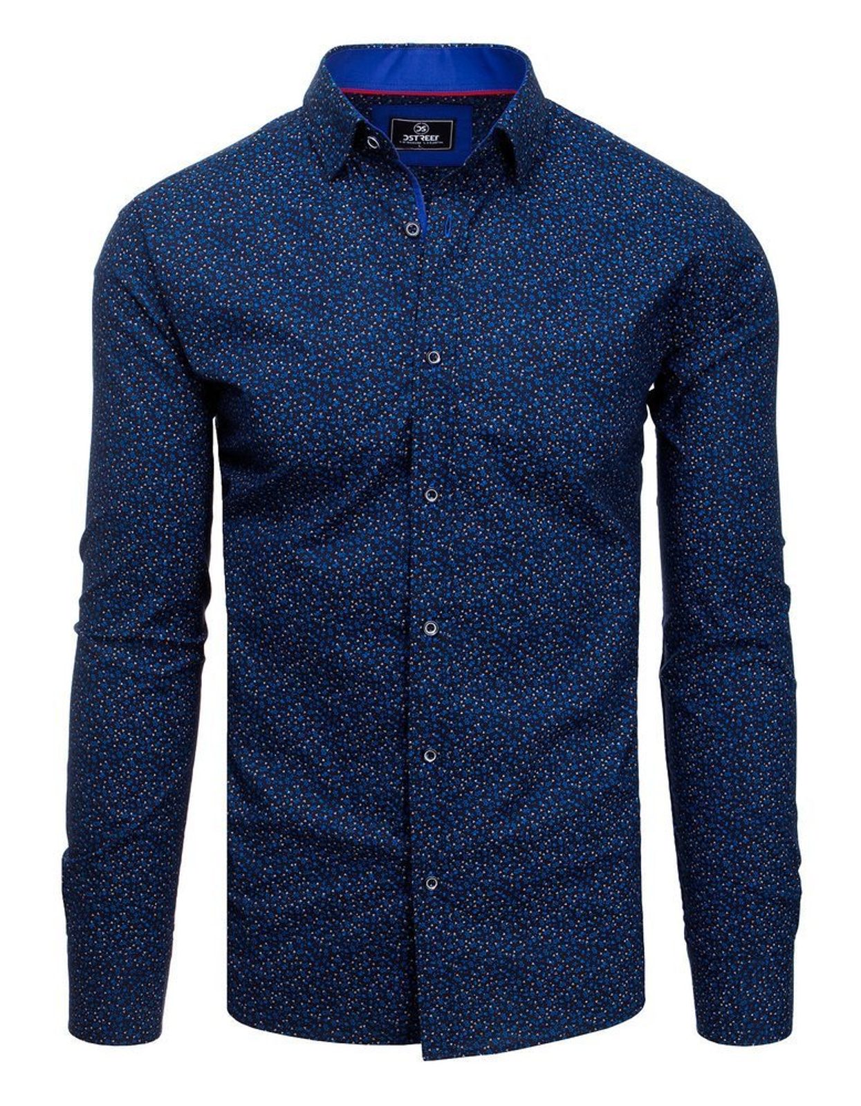 Kék karcsúsított SLIM FIT fazonú hosszú ujjú ing divatos vonalvezetéssel. Pamut anyagának köszönhetően nagyon kényelmes viseletet biztosít. Alakra szabott fazon, keskeny gallérral, visszahajtva viselhető ujjakkal. A mellvonalon zseb nélkül. Klasszikus gombolással. A gomboláspánt és a gallér halvány kék színnel kombinálva. Button down gallér.