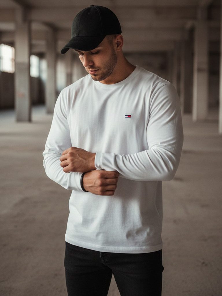 Ez az egyszerű, hosszú ujjú póló magas százalékban pamutból készült. A póló sima kivitelű, nyomtatás nélküli, kerek nyakkivágással. A modell mellkasi részén egy nem feltűnő applikáció található. A póló kényelmes és ideális a mindennapi viselethez.