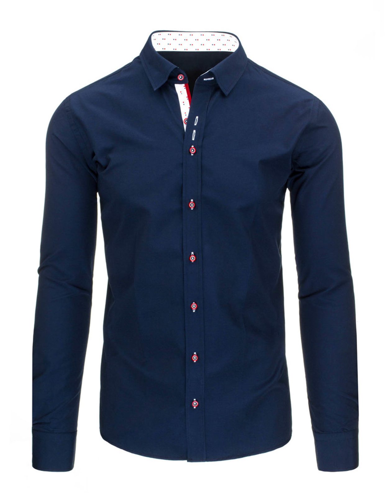 Egyszerű sötét kék elegáns ing, kénylemes minőségi anyagból, mindennapi viseletre alkalmas. Megfelelő viselet bármilyen eseményre. Slim-fit fazon, mely kiemeli az alakot. Klasszikus gombolással ellátva. A gallér belső része valamint a gomboláspánt belső része sötét kék mintás betéttel ellátva.