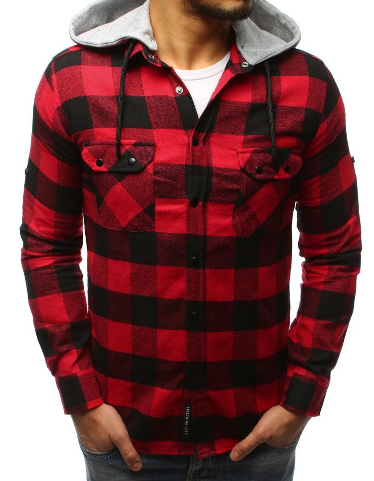 Figyelemfelkeltő kockás mintás ing, kontrasztszínű piros fekete kockás mintás kivitelben. Kiváló minőségű, puha pamut anyagból. Klasszikus, enyhén testhezálló fazon, és hosszú ujjakkal. Az alja enyhén lekerekített. Két mell zsebbel rendelkezik. Feneket takaró hossz. Halvány szürke pamut kapucnival, mely levehető.