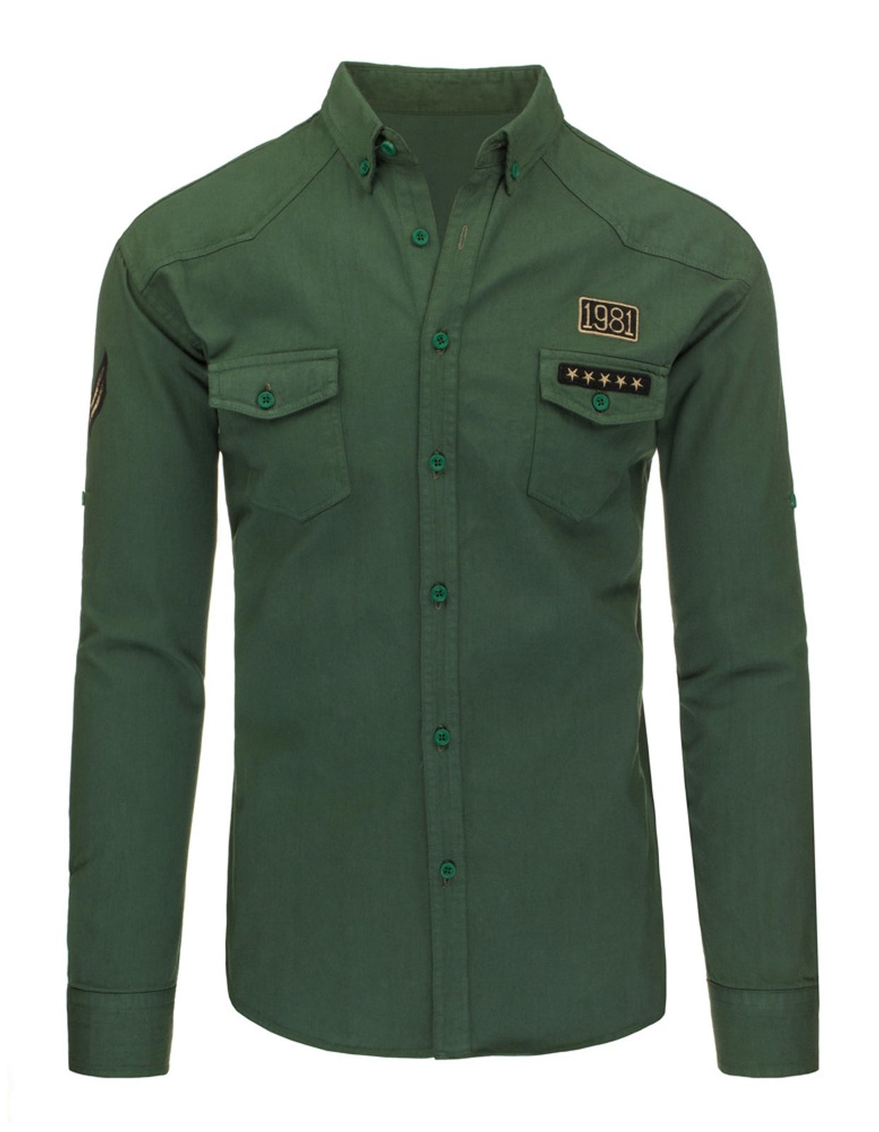 Divatos katona zöld farmer ing , kénylemes minőségi anyagból, mindennapi viseletre alkalmas. Megfelelő viselet bármilyen eseményre. Minőségi pamut anyagból. Klasszikus gombolással ellátva. két mellzsebbel ellátva. Regular fit fazon, mely kényelmes visletet biztosít. Rendkívül divatos megjelenést biztosít a mell zsebb feletti hímzett címkéknek köszönhetően.