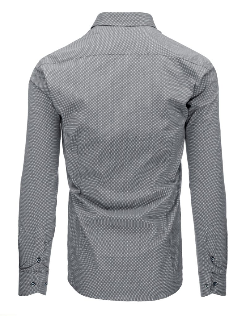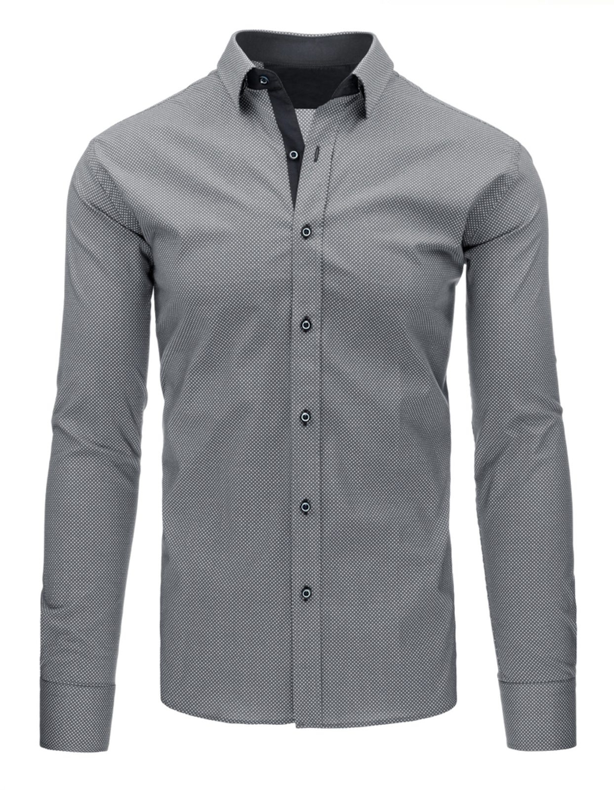 Fantasztikus férfi ing, szürke színben, apró pettyes mintával. Kényelmes anyagból, mely komfortérzetet boztosít viselőjének. Slom-fit fazon, mely tökéletesen kiemeli az alakot. A gallér és a gomboláspánt belső része kontraszínű betéttel. Az apró pettyes minta kiemeli az ing egyediségét.