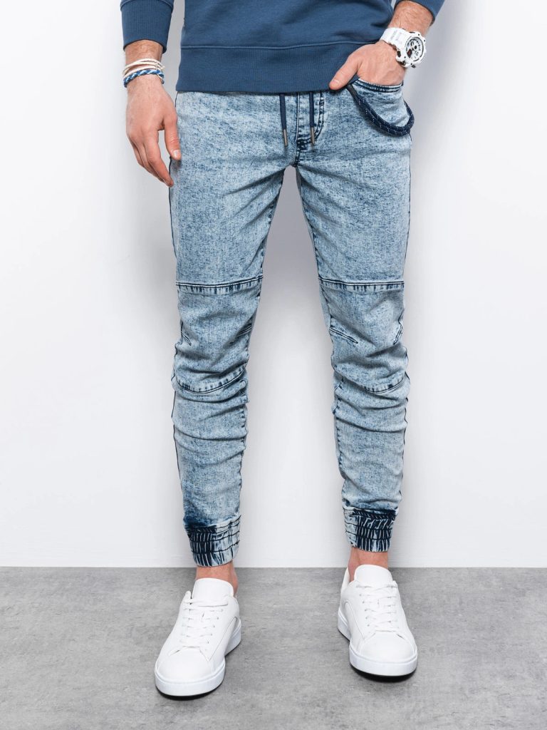 Divatos, egyszerű férfi farmer. Kék színben. Kiváló minőségű puha anyagból. Normál derékmagasságú, testhezálló fazon, hosszú, egyenes szabású gumírozott nadrágszárakkal. Derékban integrált öv, klasszikus zsebkialakítás. Gumírozott derékrész, zsinórbehúzással. Comb részen zsebfedős zsebek.