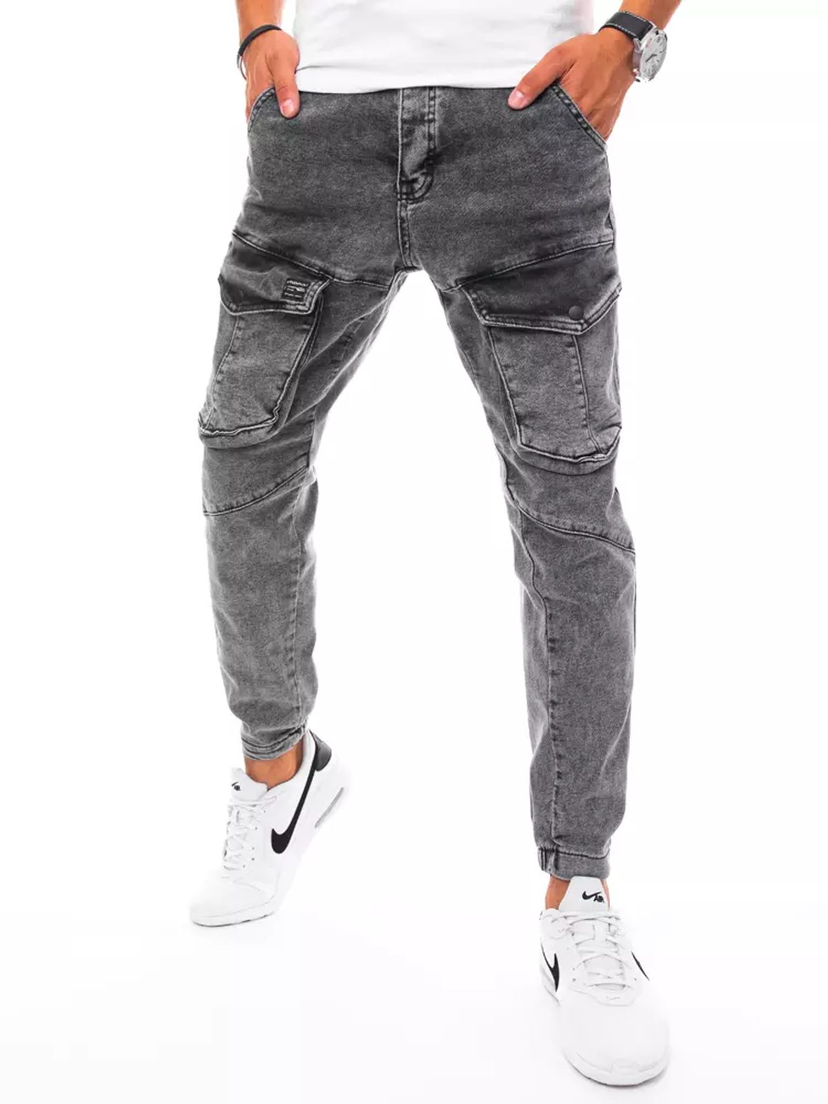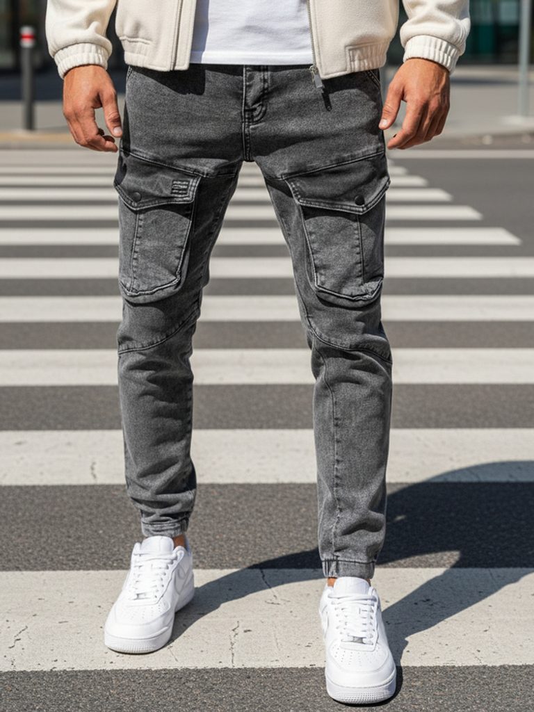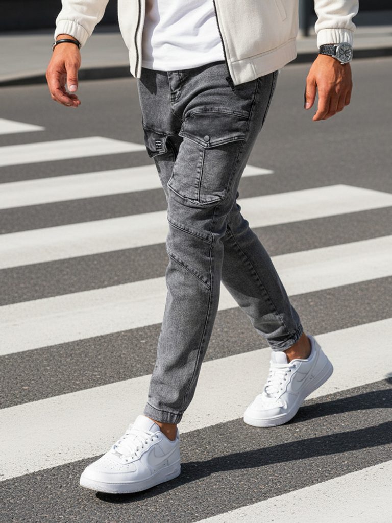 Trendi koptatott hatású szürke zsebes farmer. Tépett elemekkel. Rugalmas, puha anyagból készült. Normál derékmagasságú fazon, lefelé erősen szűkűlő, teljesen a testhez simuló lábszárakkal. Derékban integrált öv, övbújtatók, klasszikus zsebkialakítás. Gombos és cipzáras rögzítés. Ezzel a modellel nem nyúlhatsz mellé, stílusos és férfias lehetsz vele, minden időben. A lánszár nagy zsebfedő zsebekkel ellátva.