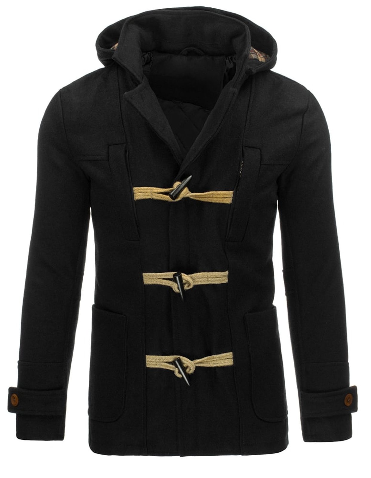 Elegáns férfi kabát mindennapi viseletre. Levehető kapucnival. Belül cipzár, kívül szegély pecekzáródással. Elől négy zsebbel ellátva. Két belső zseb. Magasabb gallér. Kényelmes viseletet biztosít. Fekete színben.