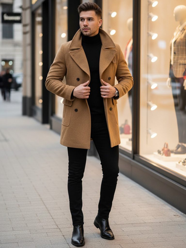 Elegáns homok színű férfi szövet kabát, mely megfelelő viseletet nyújt a hideg téli időszakra. Bézs -halvány barna színben. Finom tapintású, meleg, puha szövetből készült, alatta finom tapintású puha bélés található. Alakra szabott fazon, széles kihajtott gallérral, két soros gombolással. Kétoldalt zsebfedős zsebek. Egy belső zsebbel is rendelkezik. Combközépig érő hossz. Hátulja közepén hasítékkal. Nagyon elegáns megjelenést biztosít.