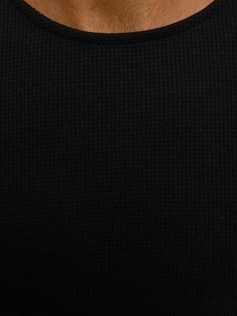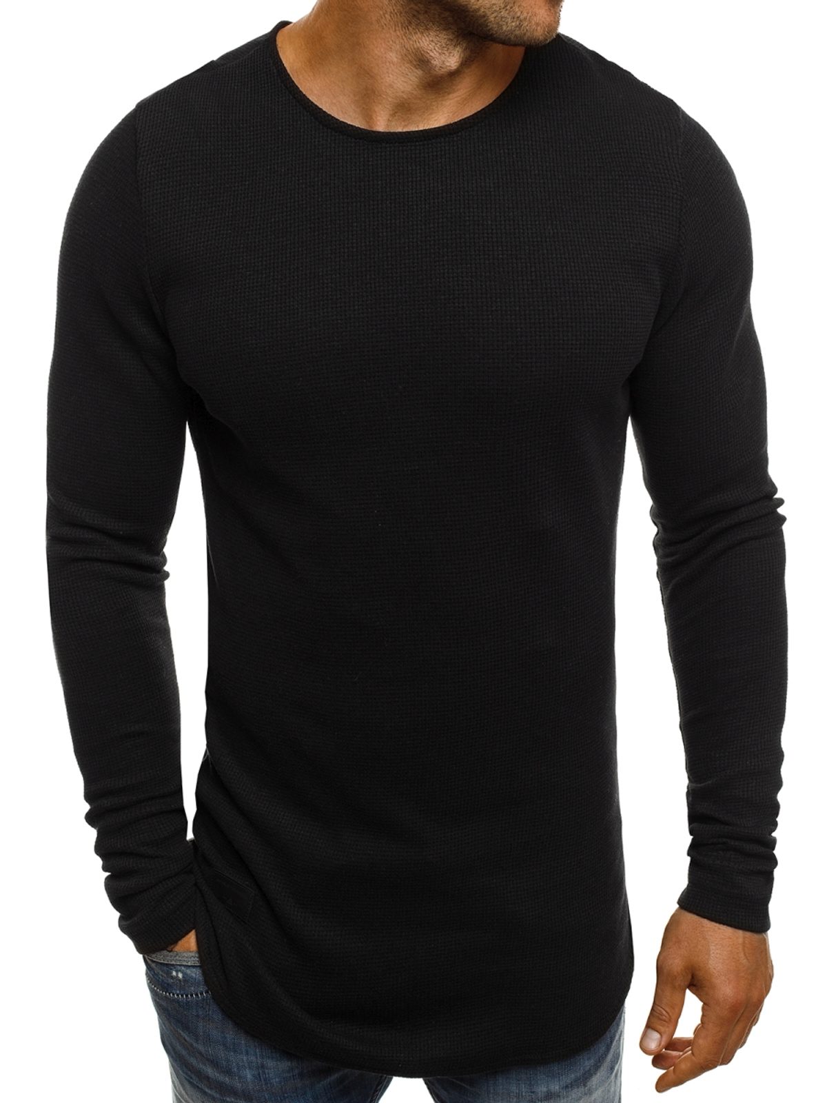 Modern, egyedi férfi hosszú ujjú póló. Kellemes viseletet biztosító, puha, szövetből készült. Enyhén testhezálló fazon, hosszú ujjakkal és kerek nyakkivágással. Minden szegély passzéval van elvégezve. Lekerekétett alj. Feneket takaró hossz.