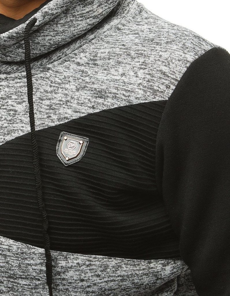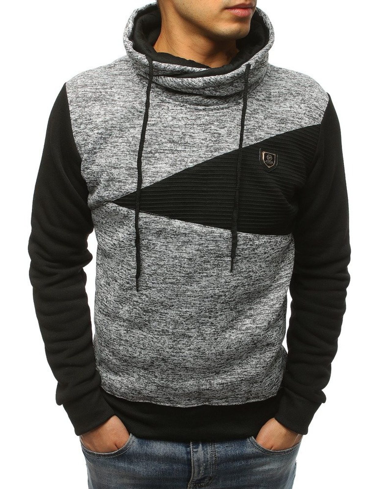 Egyedi férfi pulóver kellemes halvány szürke és fekete színben. Az ujjai fekete színben. Magas nyak megoldással. Kényelmes, puha anyagból készült mely komfortos viseletet biztosít. Megfelelő viselet nyújt egy mellény vagy egy bomber dzsekivel párosítva.